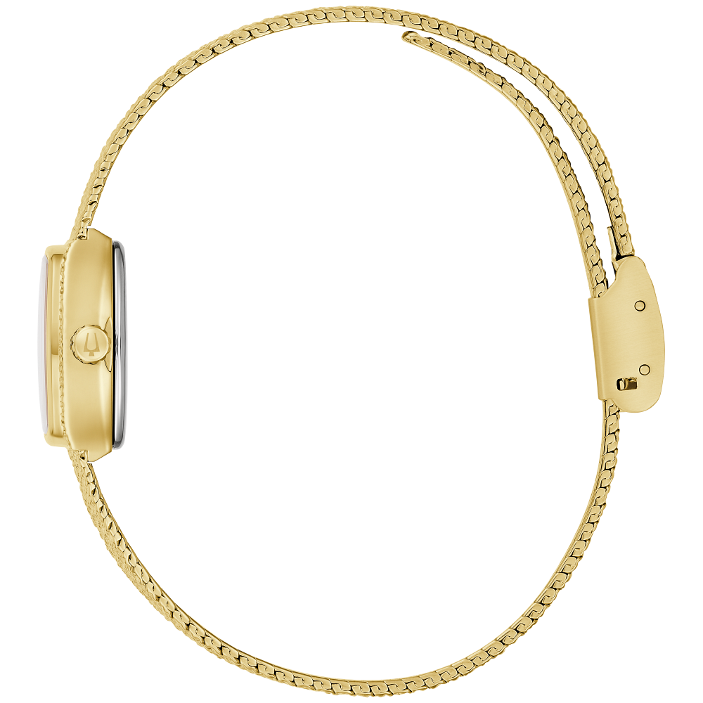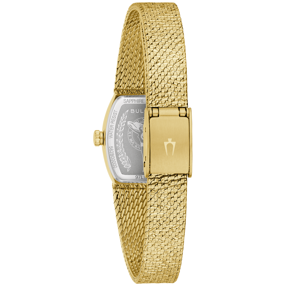 Elevate your style with the Bulova Goddess of Time - 97L184, a stunning women’s timepiece inspired by the glamour of the 1970s. This elegant watch features a gold-tone stainless steel tonneau case with a textured finish and a polished bezel that flows seamlessly into a matching textured mesh bracelet, adjustable from 6″ to 7 ¾ for a perfect fit.