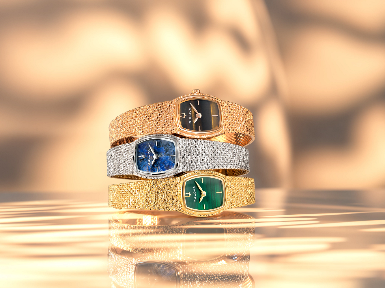 The standout feature is its genuine green malachite dial—each uniquely striated and beautifully enhanced with gold-tone applied markers and matching hands. Completing the vintage-inspired charm, the case back is intricately etched with Bulova’s iconic Goddess of Time motif. Refined and radiant, this timepiece is designed to make you feel truly divine.