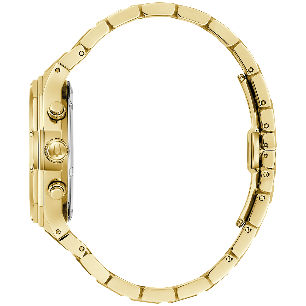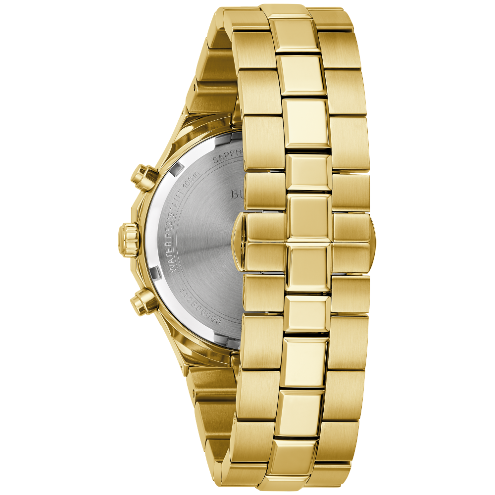 Elevate your wristwear with refined sophistication through this exceptional 6-hand chronograph from the Classic Bulova Prestige men's collection. The Prestige - 97B232 model is housed in a faceted 40mm gold-tone stainless steel case, distinguished by its architectural geometric bezel and a flat sapphire crystal treated with anti-reflective coating—ensuring clarity and elegance from every angle. With 100 meters of water resistance, it seamlessly blends form and function.