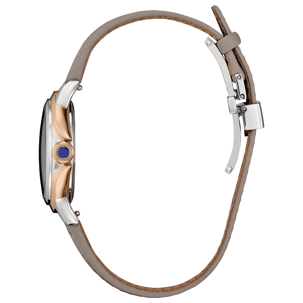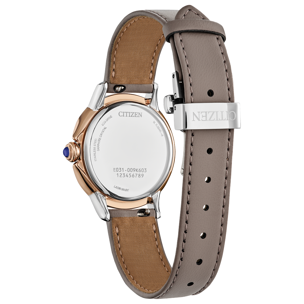 The taupe dial adds soft sophistication, highlighted with pink gold-tone Roman numeral indices and matching hands for a graceful, feminine aesthetic. Powered by Citizen’s Eco-Drive technology, the Ceci runs on any light source and never needs a battery. With its versatile styling, this watch transitions seamlessly from special events to everyday wear, making it a timeless piece for any occasion. Equipped with Calibre E031.