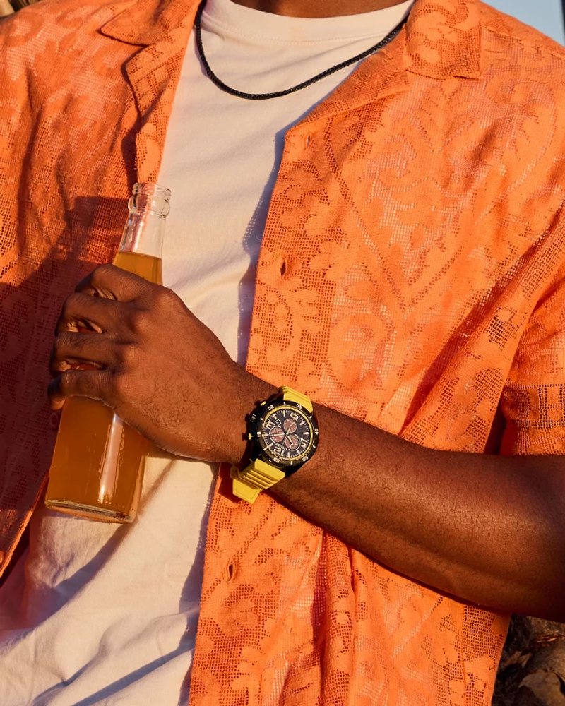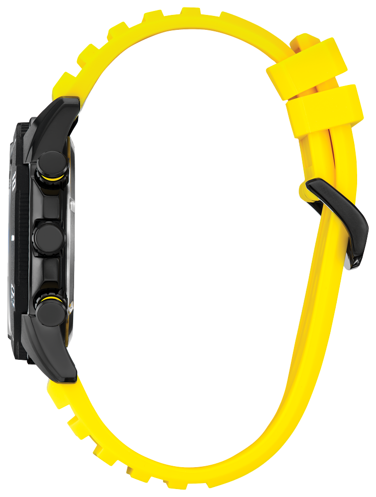 A rotating 60-minute bezel enhances its functionality, while the durable yellow silicone strap ensures a comfortable and secure fit for active lifestyles. The black dial is complemented by luminous hour markers and a yellow tachymetric scale, giving it a distinctive, high-contrast look that ensures maximum legibility.