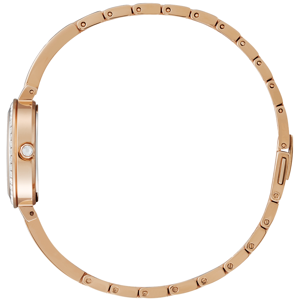 The pink rose gold-tone stainless steel case and bracelet are adorned with shimmering crystals, adding a luxurious brilliance to your wrist. Its Mother-of-Pearl dial, accented with delicate crystal hour markers, creates a luminous and sophisticated look. The elegant bangle-style bracelet allows this watch to be worn as a standalone statement or layered effortlessly with other accessories.