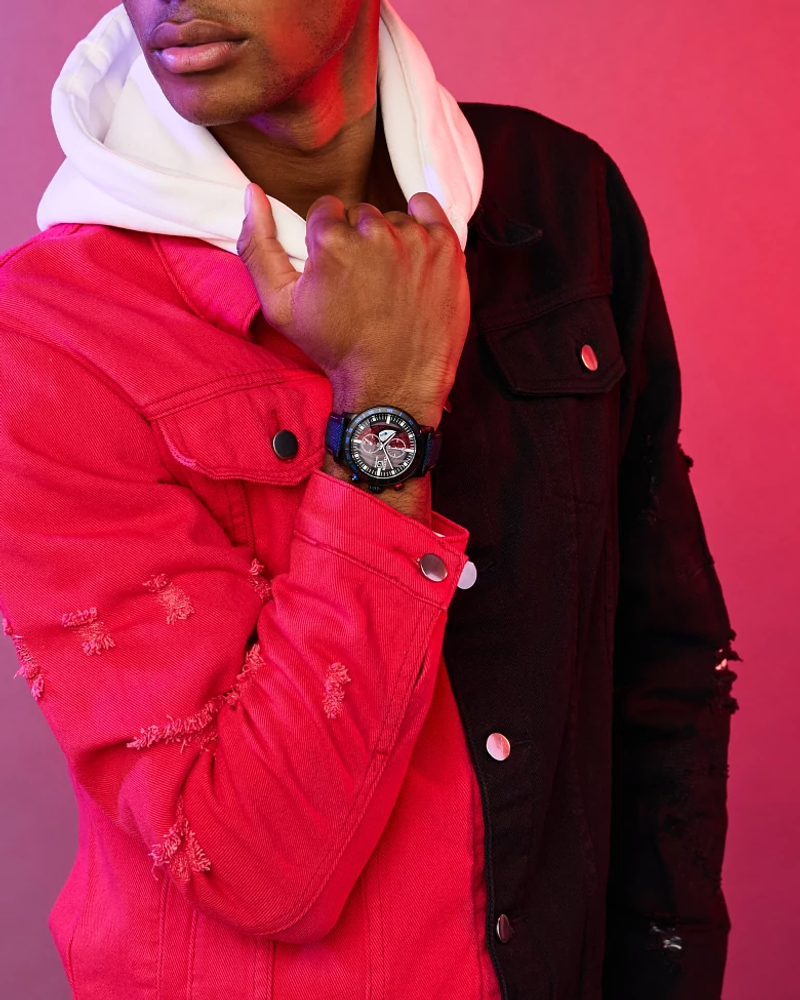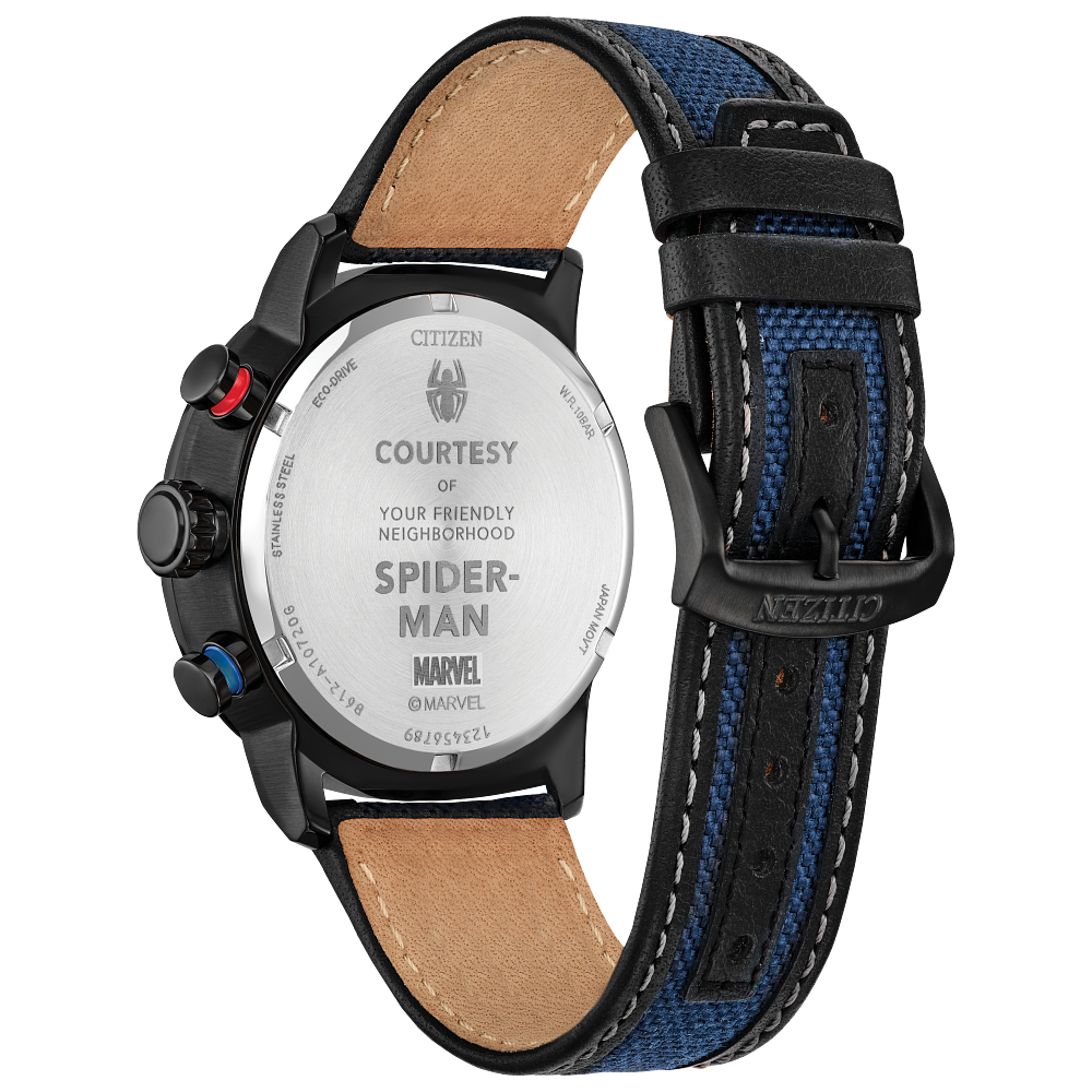 Turn the watch over to discover an engraved message on the case back: “Courtesy Of Your Friendly Neighborhood Spider-Man.” Completing the design is a durable blue Cordura nylon and black leather strap for a sporty, urban edge.