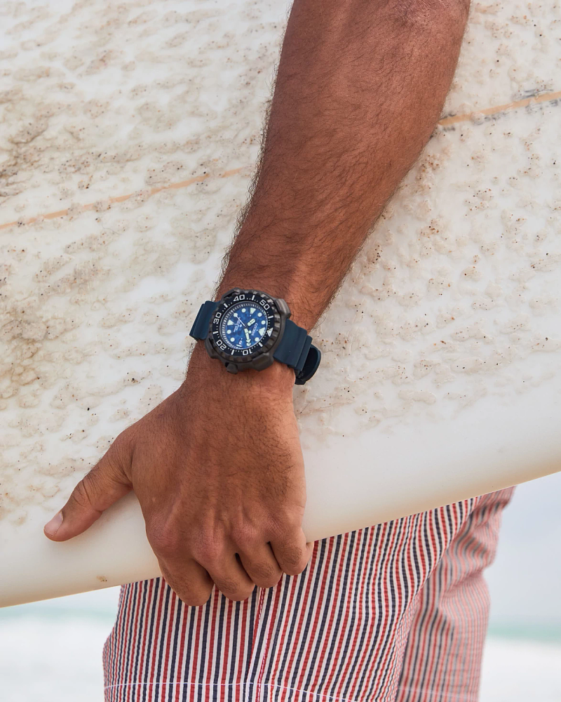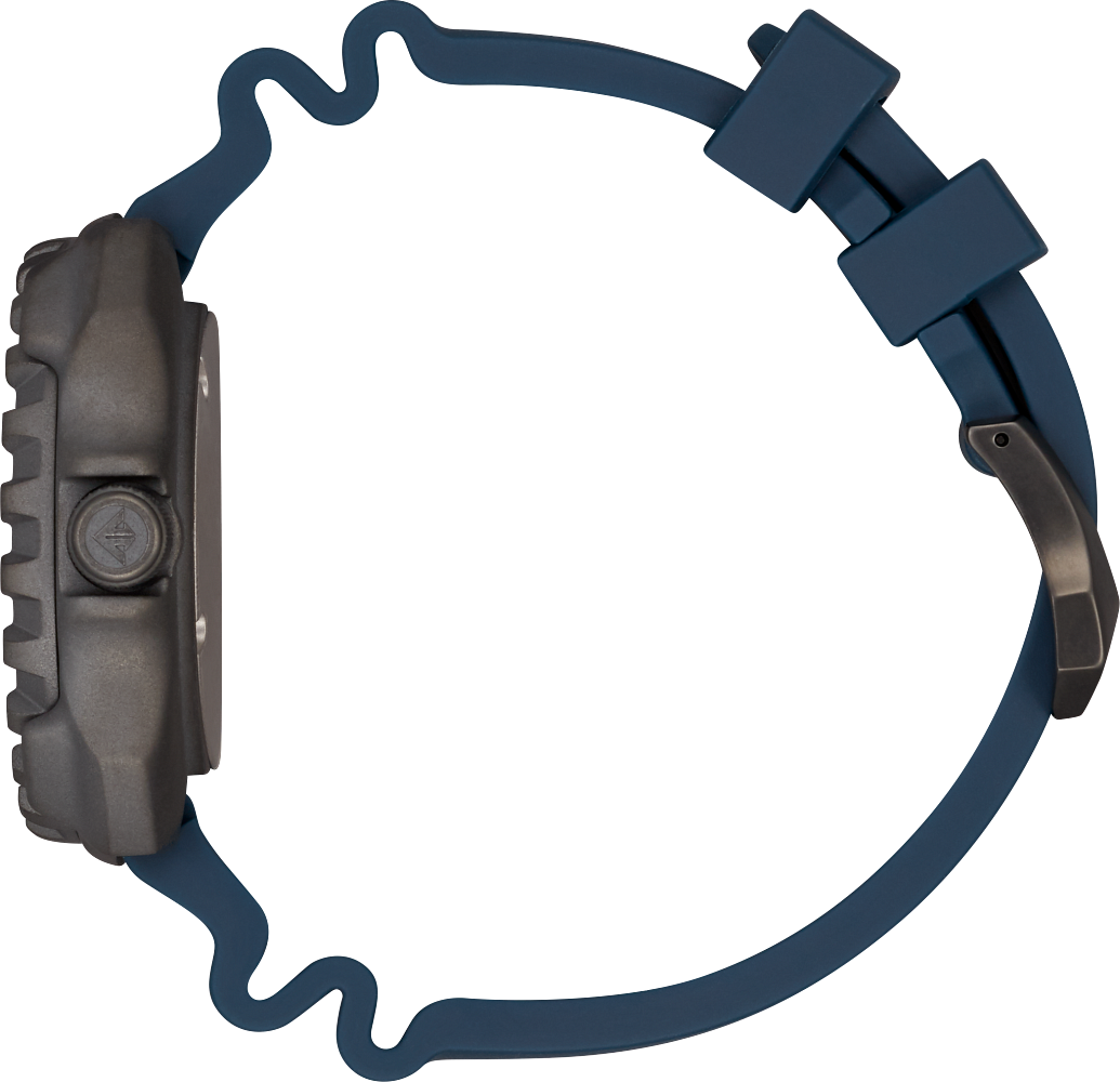 Paired with a blue silicone strap featuring a wet suit extender, it ensures a secure and adaptable fit for all dive conditions. The one-way rotating elapsed-time bezel, screw-down crown, and screw-back case ensure reliability at depths of up to 200 metres water resistance, making it ideal for professional and recreational divers alike.