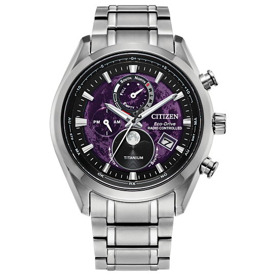 Crafted with a 43mm silver-tone Super Titanium™ case, its sharp, faceted edges and elevated profile create a bold and modern look. The deep purple dial features black accents and silver-tone details, offering a striking yet highly legible display. At the 6 o’clock position, a beautifully designed window showcases the current moon phase—an homage to the moon’s surface and the inspiration behind the Tsuki-yomi name.