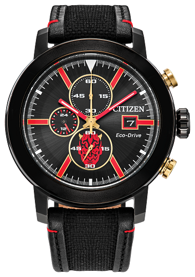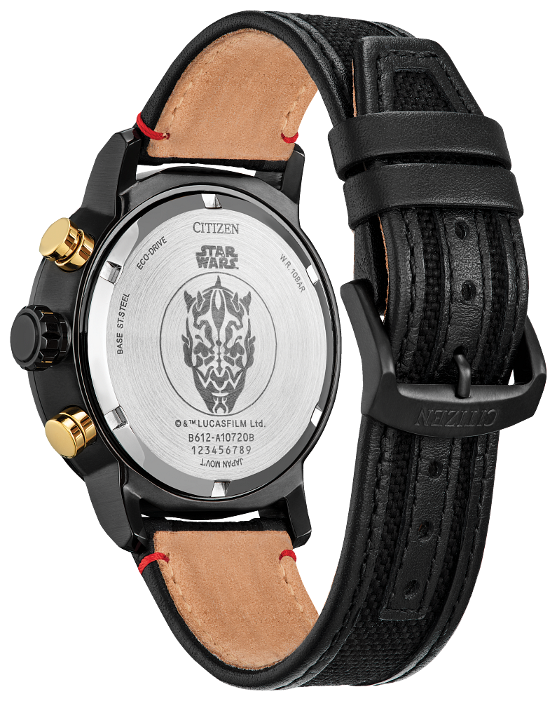 Unleash your inner Sith with the Star Wars - CA0766-02W, a bold chronograph from the STAR WARS™ | Citizen collection that pays tribute to the fearsome Darth Maul. Marking 25 years since his iconic debut, this striking timepiece features intricate design elements such as Darth Maul’s tattooed visage on the seconds sub-dial and engraved on the case back. His iconic double-bladed red Lightsaber™ is mirrored in the red-accented hands and dial illustration, while gold-tone chronograph pushers represent his distinctive yellow horns. The Star Wars - CA0766-02W is housed in a black ion-plated stainless steel case and paired with a rugged black Cordura® nylon strap with leather trim. Though it draws inspiration from the dark side, it’s powered by light using Citizen’s Eco-Drive technology—never needing a battery.