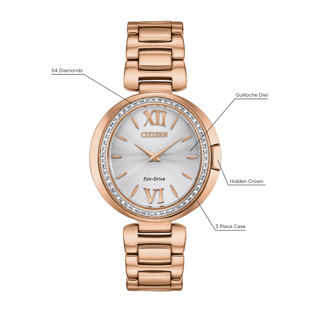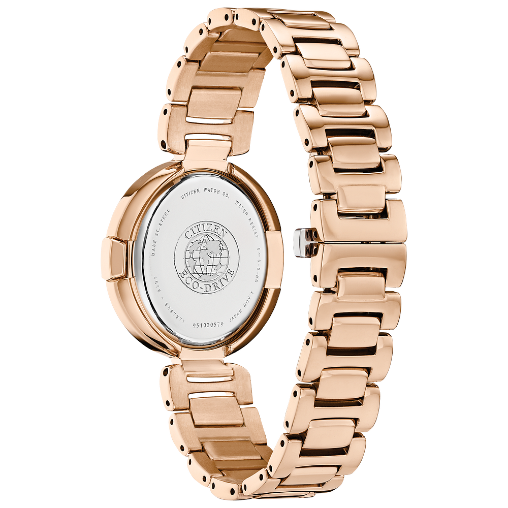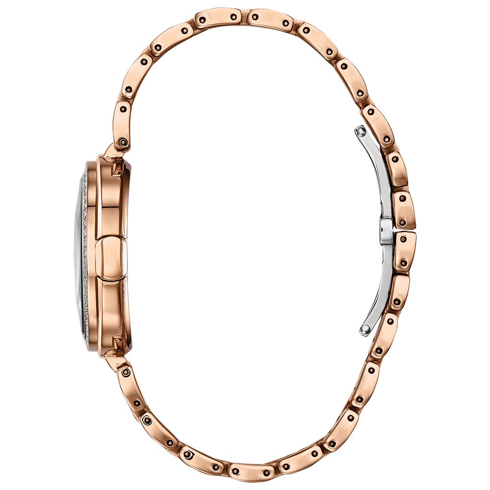 Experience refined elegance with the Citizen Capella – EX1503-54A, a timepiece that showcases Citizen’s mastery of modern design. The Capella Collection is defined by smooth curves, seamless lines, and innovative craftsmanship—and this model embodies it beautifully. The pink gold-tone stainless steel case and bracelet flow together effortlessly, enhanced by an integrated crown for a sleek, uninterrupted silhouette. A radiant silver dial adds a touch of sophistication, while a sparkling diamond elevates the watch’s luxurious appeal. Powered by Eco-Drive technology, it runs on any light source and never requires a battery, offering style and sustainability in perfect harmony.