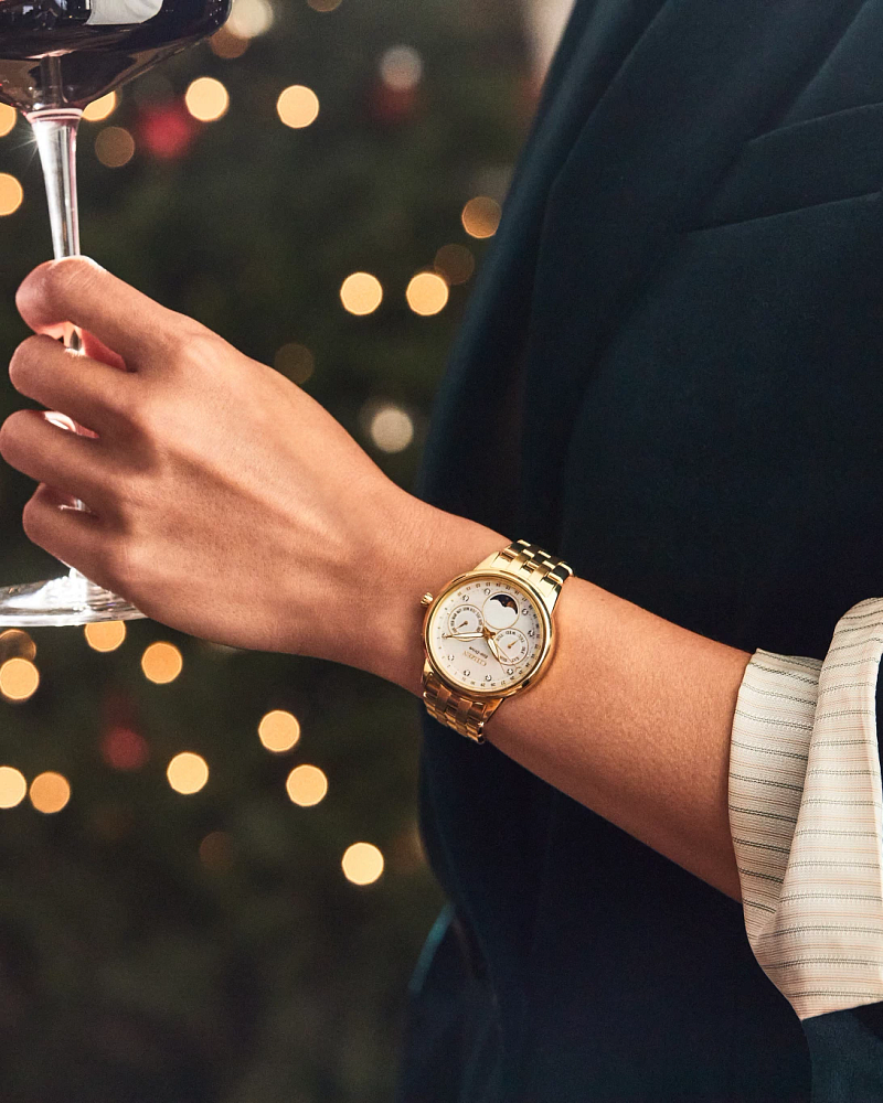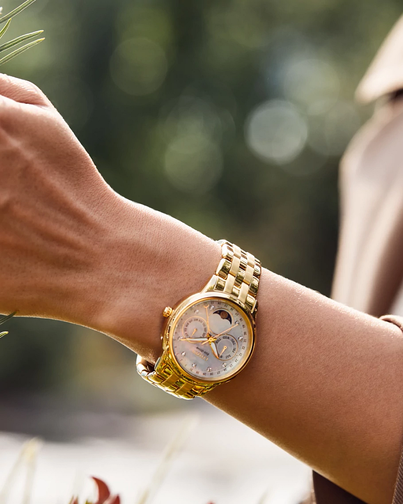 Beyond its beauty, the Calendrier offers exceptional functionality — displaying the month, day, and date, while also tracking the phases of the moon for a celestial touch of artistry. The gold-tone stainless steel bracelet features a secure deployment clasp, ensuring both comfort and style for everyday wear.