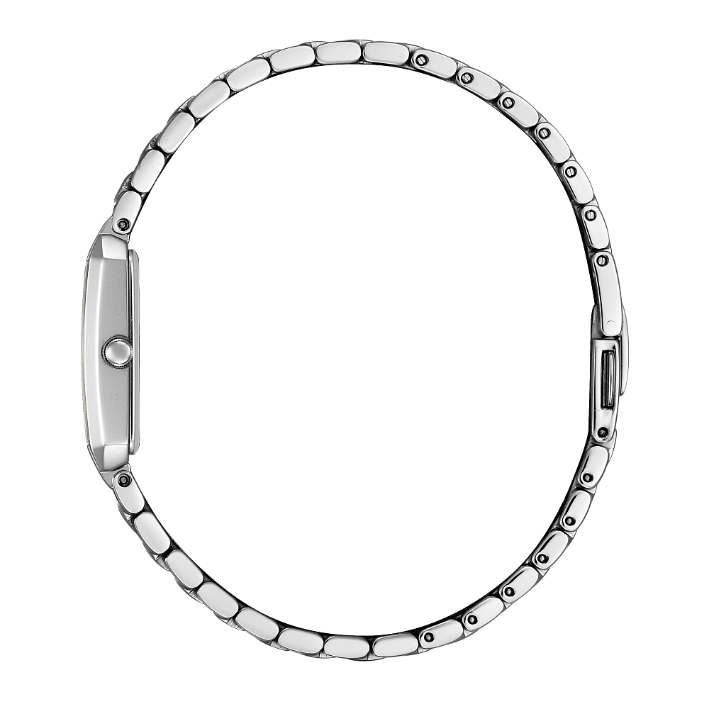 Featuring a rectangular stainless-steel case (30.5 x 14.5 mm) and a matching stainless-steel bracelet, the watch offers a sleek, feminine fit that sits comfortably on the wrist. The mother-of-pearl dial adds a subtle radiance, capturing light beautifully for an understated yet luxurious appeal.