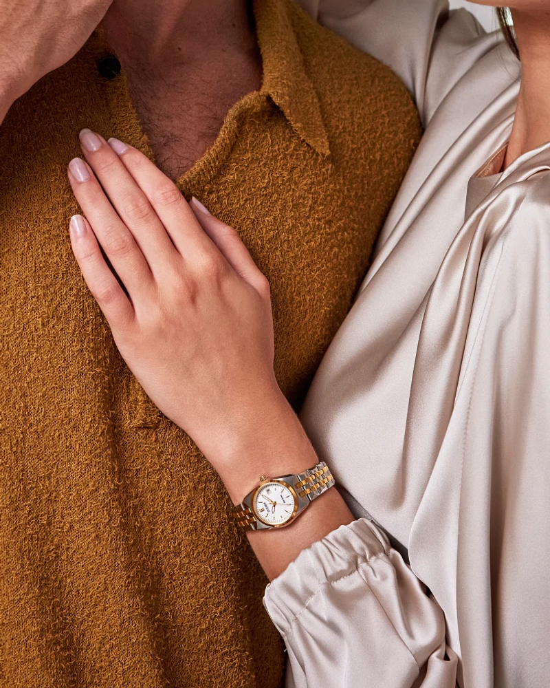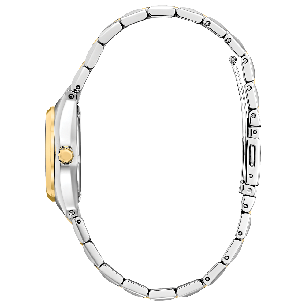 The two-tone gold and silver-tone stainless steel case and bracelet enhance its luxurious appeal, while the white dial with gold-tone markers and luminous hands ensures a clean and radiant look. A date display adds practical convenience, and the fold-over clasp with hidden push buttons guarantees a secure and comfortable fit.