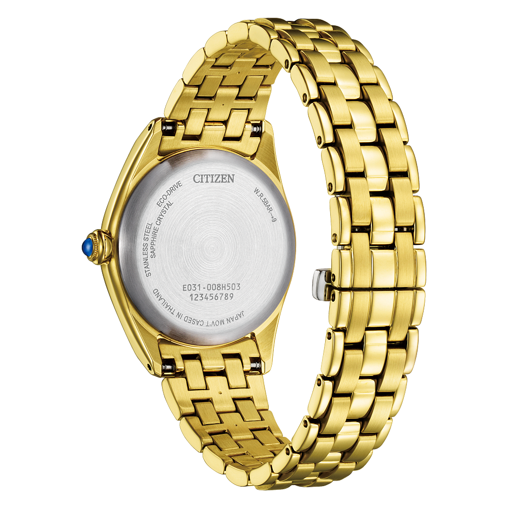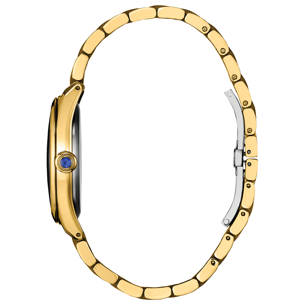 Elegant, versatile, and effortlessly stylish, the Citizen L Classic – EM1142-84L is designed to shine from the office to evening outings. The 33mm yellow gold-tone stainless steel round case connects seamlessly to a faceted five-link bracelet, creating a refined look enhanced by a synthetic sapphire-set crown.