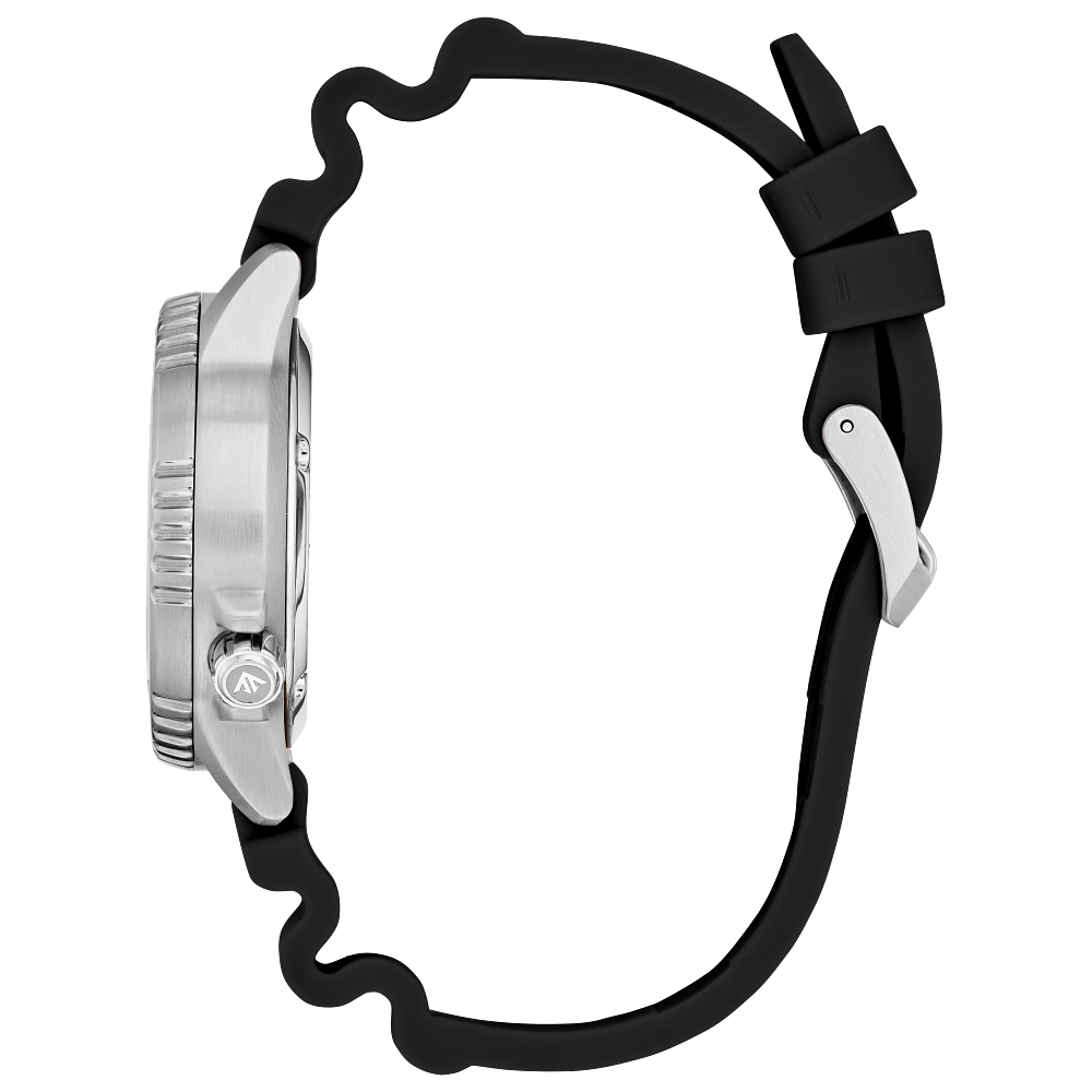 Built with a silver-tone stainless steel case, easy-grip rotating dive bezel, and screw-down crown at 4 o’clock, this rugged timepiece offers durability and precision. The black polyurethane strap ensures comfort and security, whether underwater or on land.
