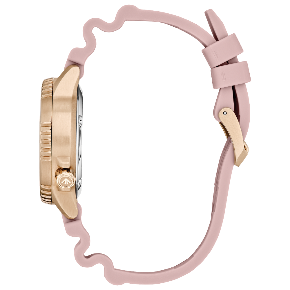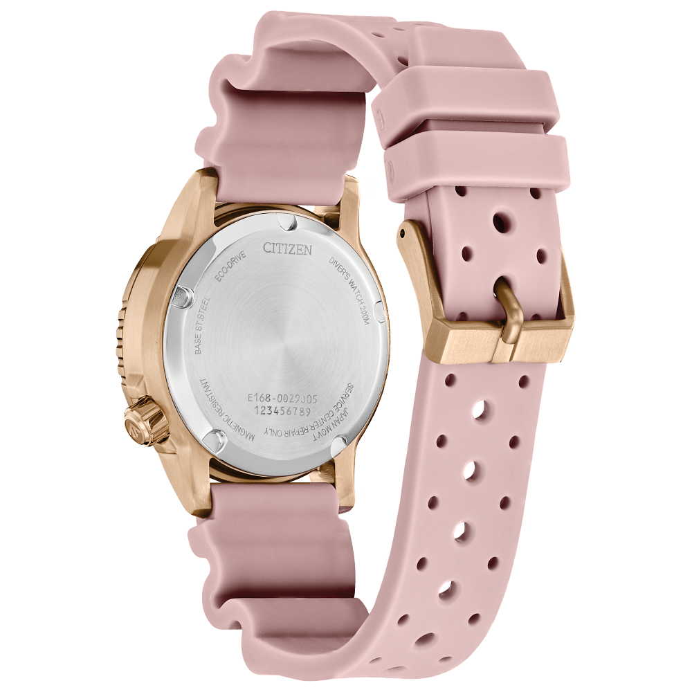 Dive into style and performance with the latest addition to the Citizen Promaster Dive Collection. Designed with a versatile 36.5mm rose gold-tone stainless steel case, easy-grip rotating dive bezel, and screw-down crown at 4 o’clock, this watch is as fashionable as it is functional.