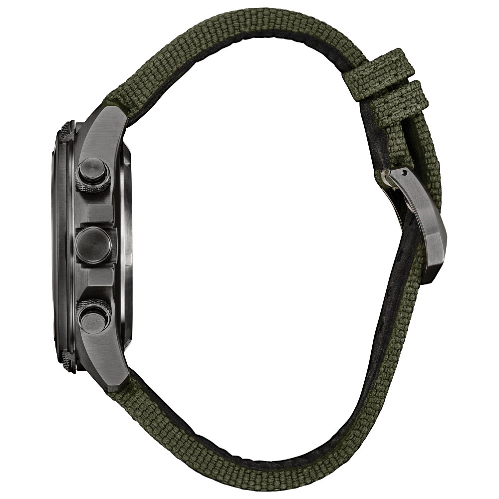 Built tough in a 43.9mm grey-tone stainless steel case with a rugged Cordura® strap. Featuring a forest green dial with luminous hands, rotating compass scale, and hybrid digital-analog display.