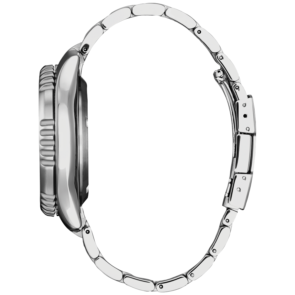 The Citizen Promaster Dive Automatic - NY0151-59X Green Bezel Edition reinterprets the iconic 1989 diver in a bold, modern design. Featuring a 44mm stainless steel case and bracelet, sapphire crystal, and a green bezel with matching green dial, it combines style with performance. Luminous markers enhance visibility, while the automatic Calibre 8204 ensures reliable movement. ISO compliant and 200M water resistant, it arrives in a special collector’s dive tank box.