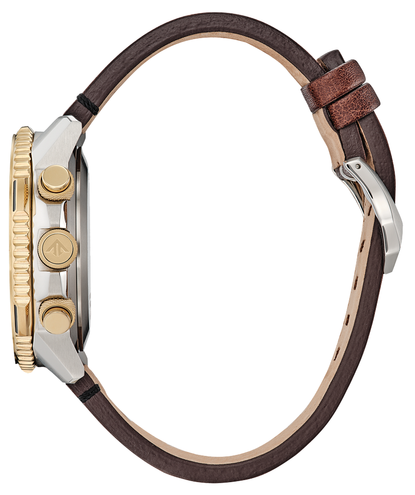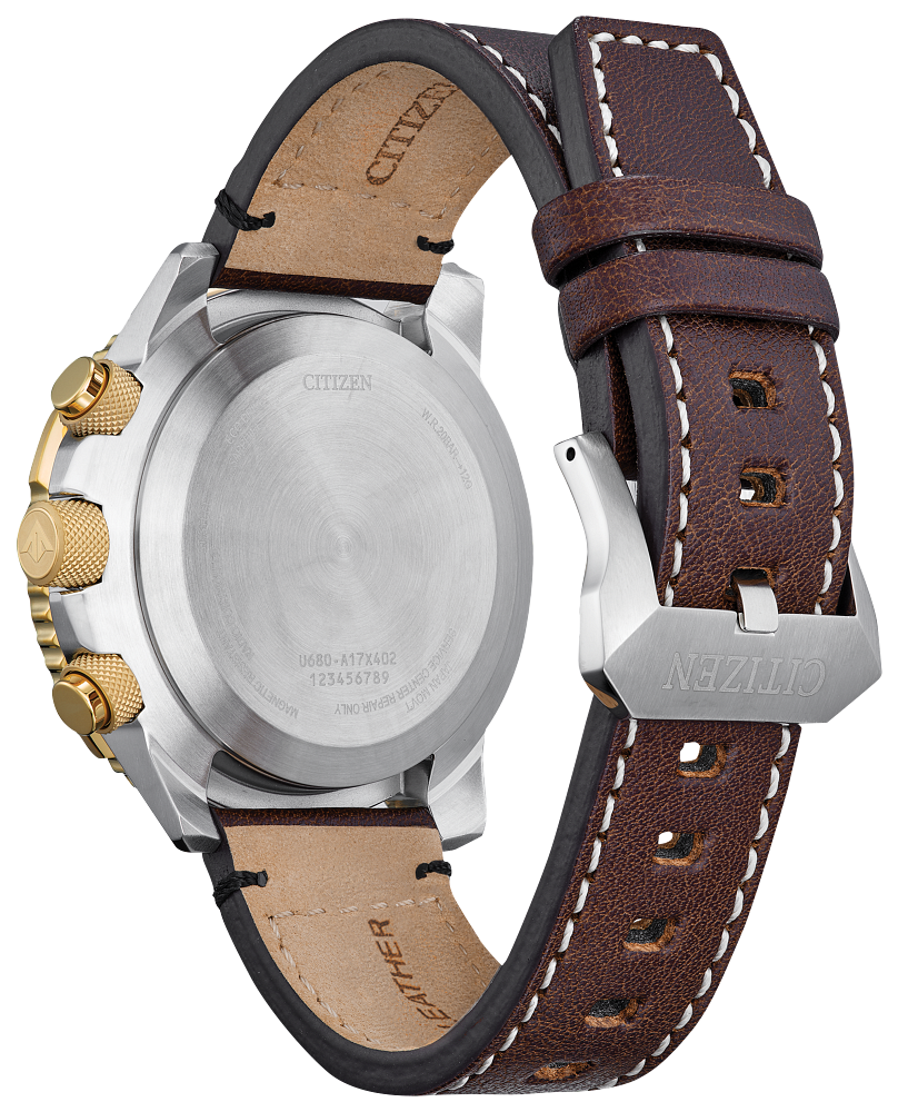 The CITIZEN Promaster Skyhawk A-T blends advanced aviation technology with timeless style. Featuring atomic timekeeping in 43 cities, chronograph, alarms, and Eco-Drive light-powered movement, it delivers unmatched precision without ever needing a battery. Finished with a two-tone stainless steel case, sapphire crystal, and brown leather strap, this watch is water-resistant up to 200m and built for performance.