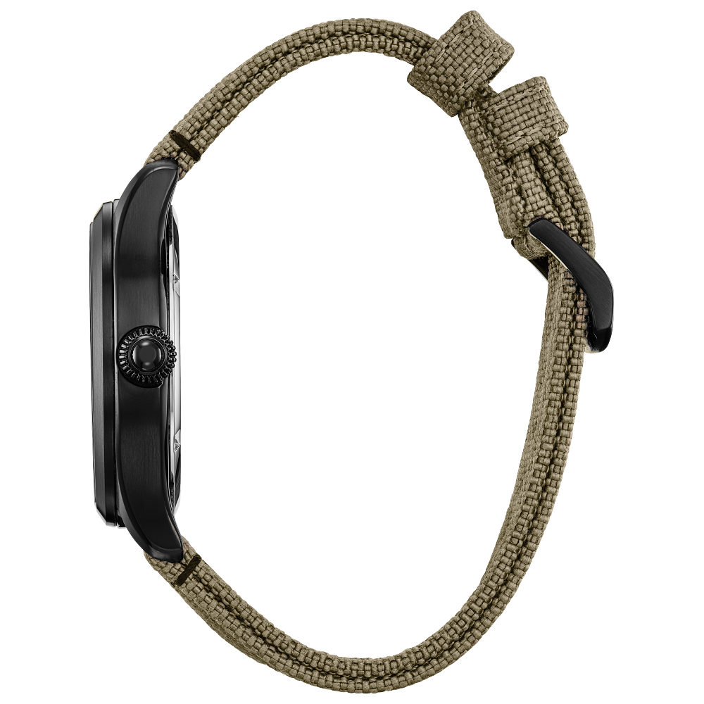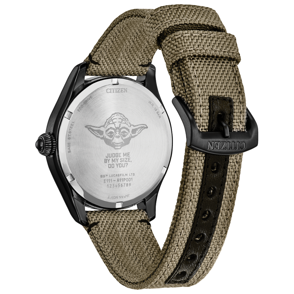 Channel the wisdom and power of the Jedi with the Yoda™-inspired Citizen timepiece, a standout from the Star Wars™ | Citizen collection. Driven by Citizen’s signature Eco-Drive technology, this watch never requires a battery—offering convenience and sustainability in one galactic package. The bold black ion-plated stainless steel case frames a sand-toned dial, subtly contrasted by luminous hands and markers that spell out Y-O-D-A, symbolizing your alliance with the light side. A 3-hand configuration and date display enhance both form and function. On the case back, you’ll find an engraving of Yoda alongside his legendary quote: “Judge me by my size, do you?” Finished with a rugged Cordura® nylon strap that reflects the durability and spirit of the Jedi Master himself. Powered by Caliber E111.