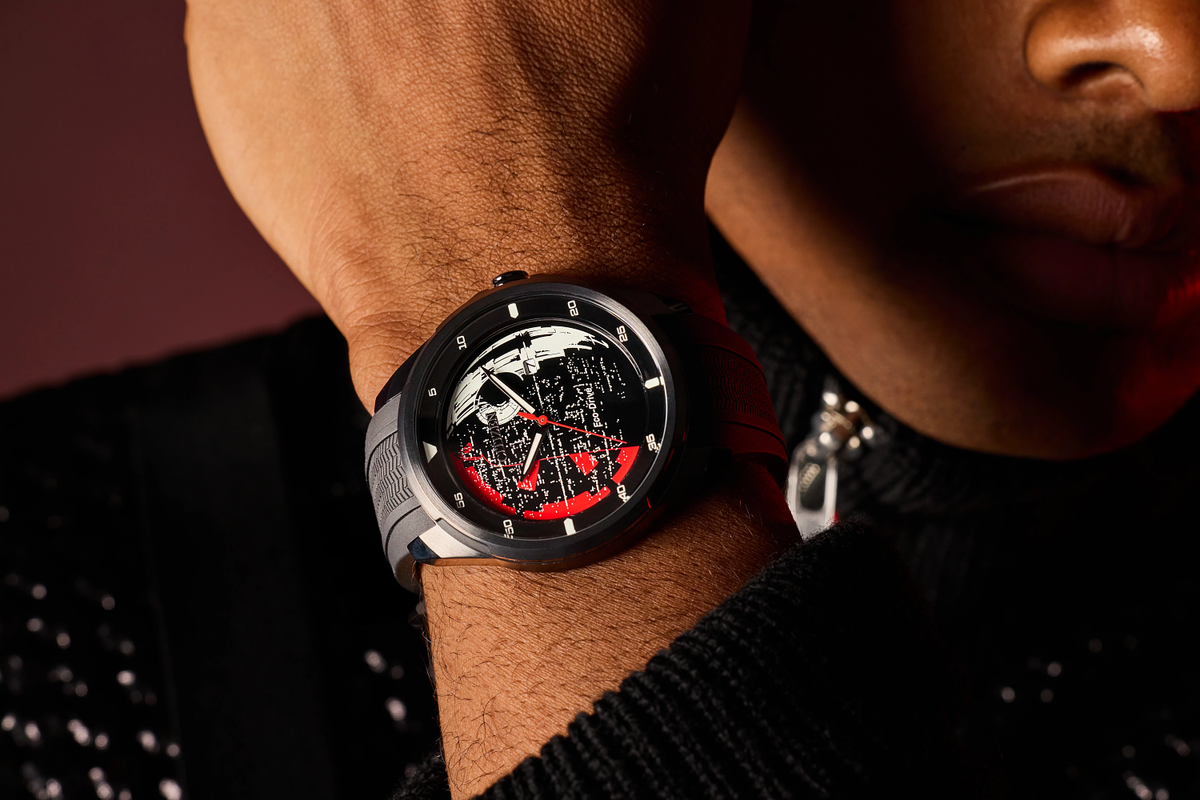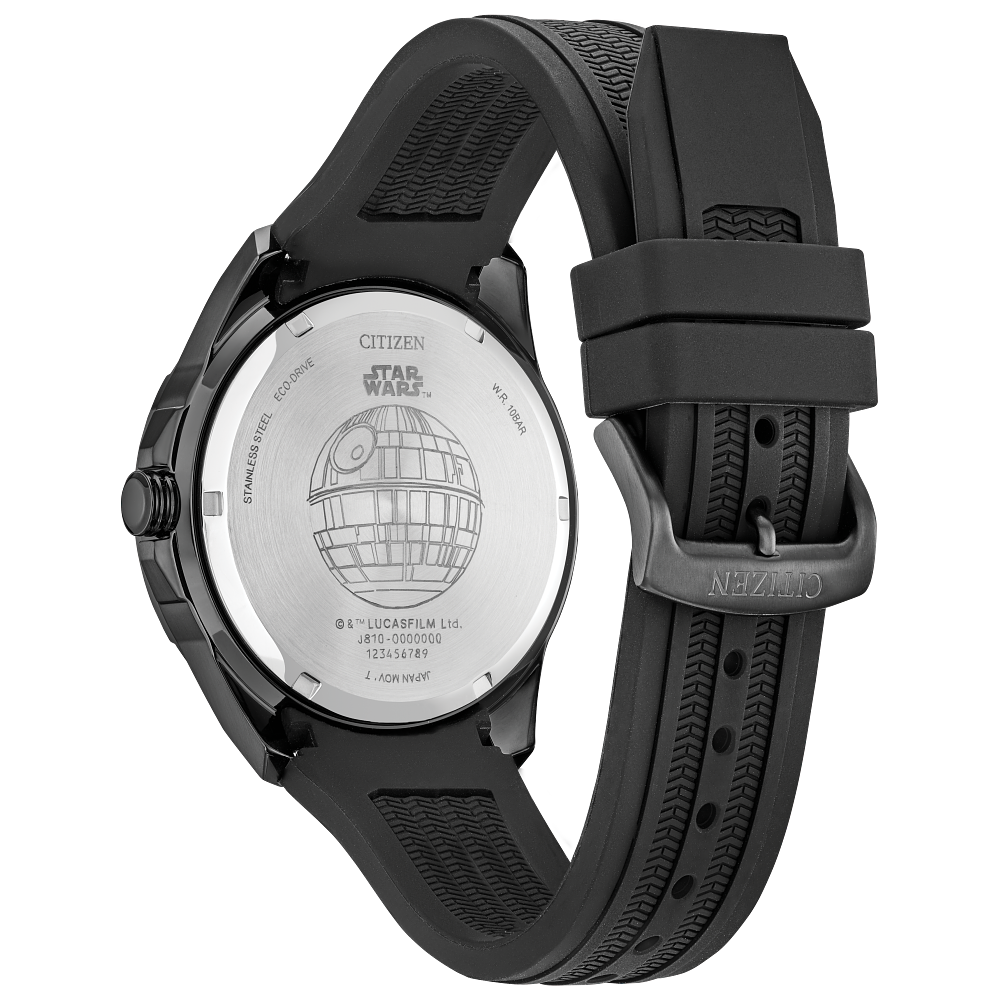 Embrace the ominous force of the Empire with the Star Wars - AW1606-06W, a commanding timepiece inspired by the Death Star and Darth Vader’s looming presence. This striking watch features a 45mm brushed black ion-plated stainless steel case, encasing a dark dial that highlights the menacing image of the Galactic Empire’s space station. Subtle shadows of the Imperial symbol and Darth Vader add depth to the design, while the red second hand and illuminated details on the dial and bezel enhance its galactic appeal. On the case back, another view of the Death Star is etched for collectors to admire. The Star Wars - AW1606-06W is powered by Citizen’s Eco-Drive technology, which runs on any light source, and is finished with a durable black textured silicone strap and buckle clasp—making it the perfect addition to any Star Wars™ fan’s collection.