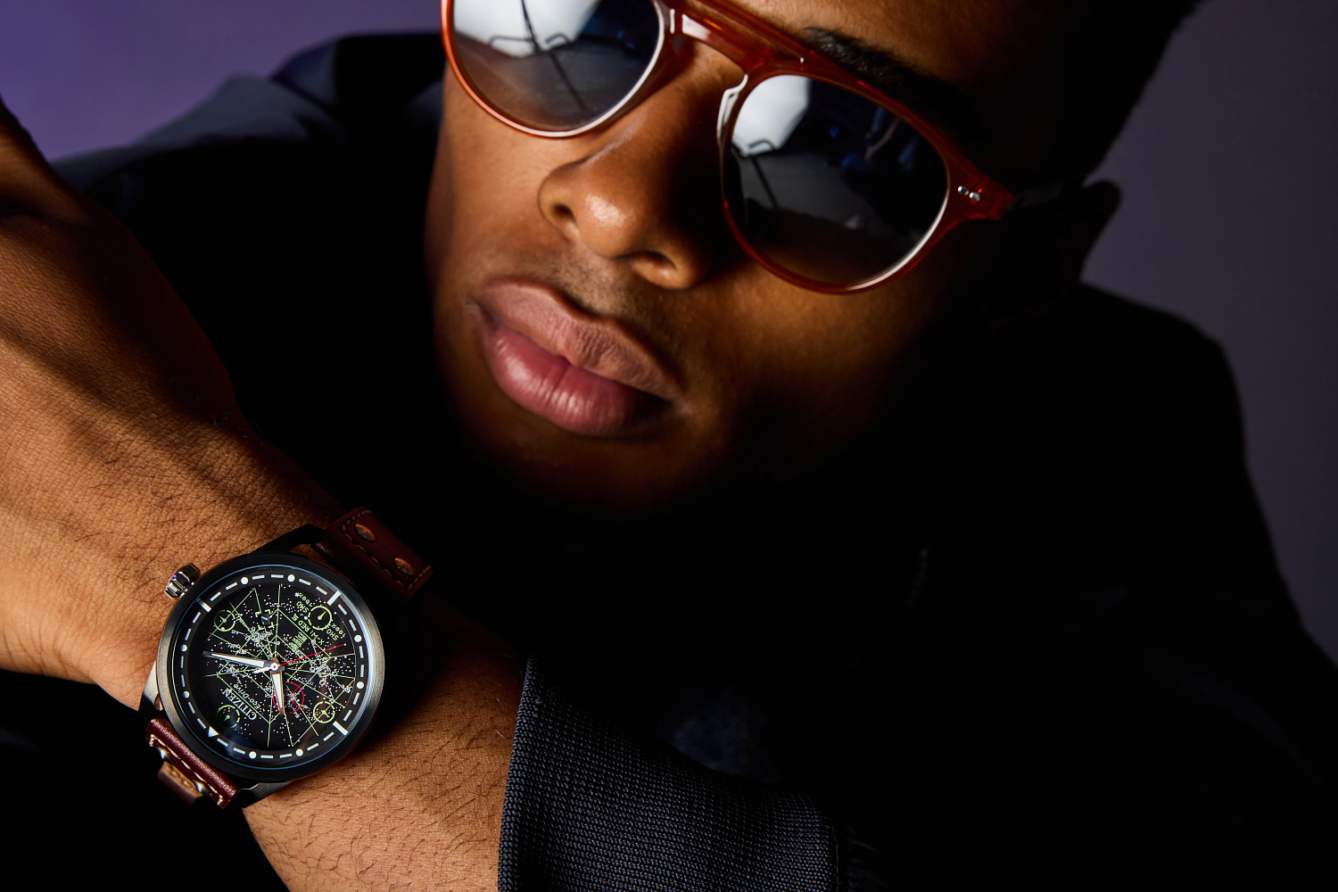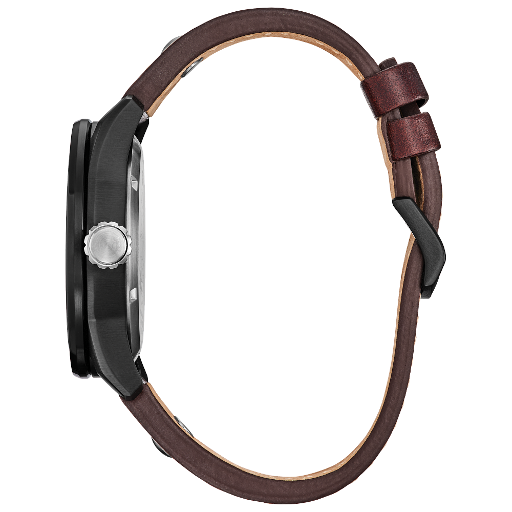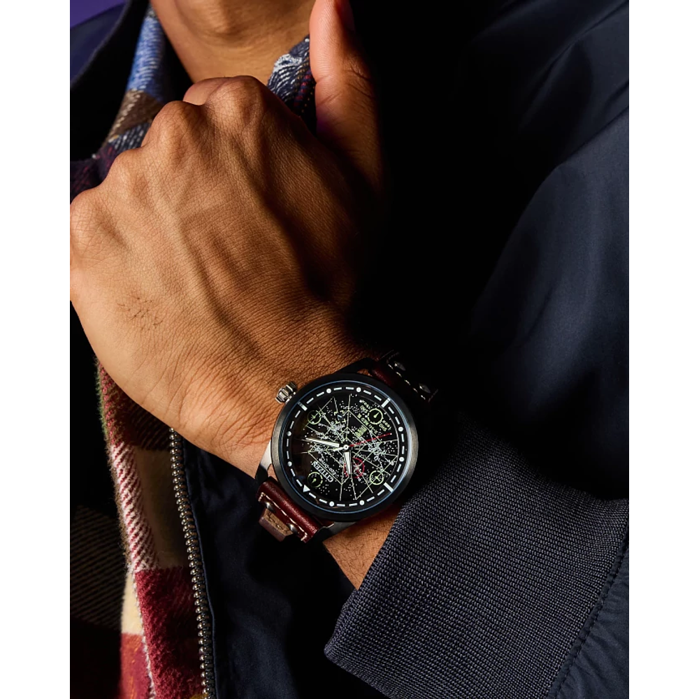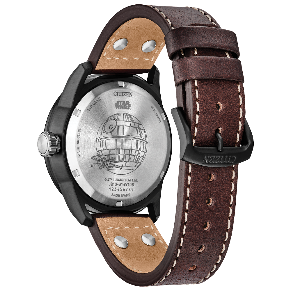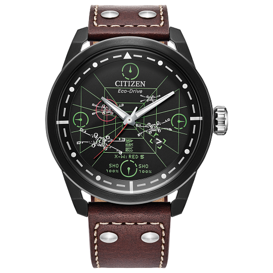 Celebrate the iconic starfighter battles of the galaxy with the Star Wars - AW1738-05W, a timepiece that captures the clash between the Rebel Alliance and the Galactic Empire. Featuring a bold black dial designed to resemble the cockpit view of a TIE Fighter, this watch showcases the legendary X-wing in striking white and neon green detailing, accented with red highlights and luminous hands and markers. Housed in a robust 45mm black ion-plated stainless steel case, the Star Wars - AW1738-05W is paired with a rugged brown leather strap featuring studs and top stitching, reinforcing its military-inspired design. The case back is etched with an X-wing approaching the Death Star, making this a must-have for any Star Wars™ enthusiast. Powered sustainably by Citizen’s Eco-Drive technology, it runs on any light source and never needs a battery.