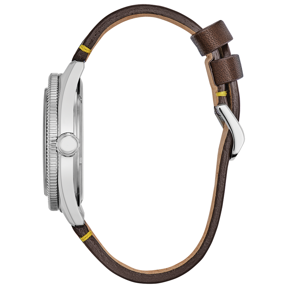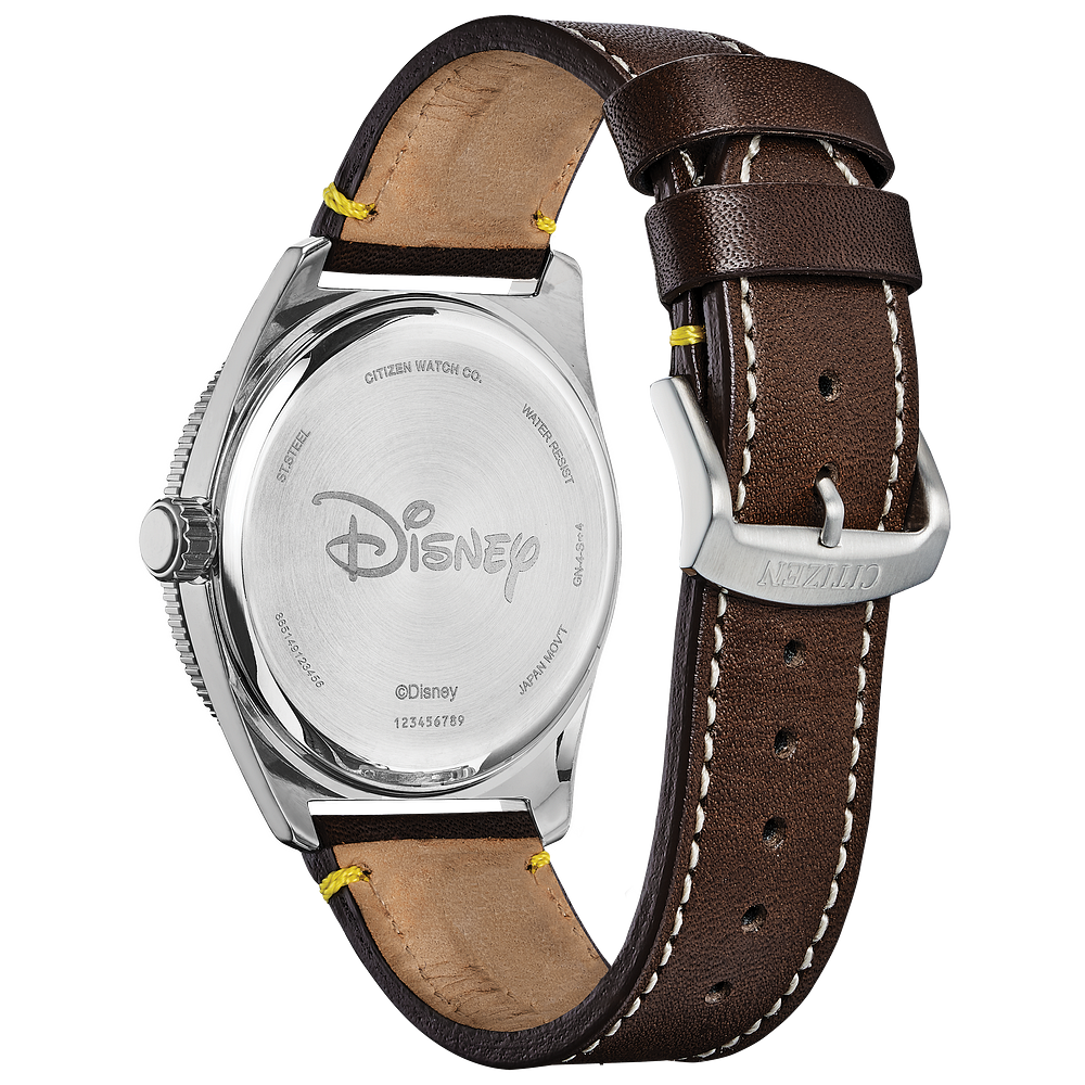 Attention, Mickey Mouse enthusiasts! This charming, vintage-style Disney timepiece showcases a vibrant yellow Mickey Mouse silhouette set against a sleek navy blue dial with a date display. The polished stainless steel case pairs perfectly with a rich brown leather strap, detailed with contrast stitching for a classic touch. Powered by Citizen’s Eco-Drive technology, it harnesses any light source and never requires a battery.