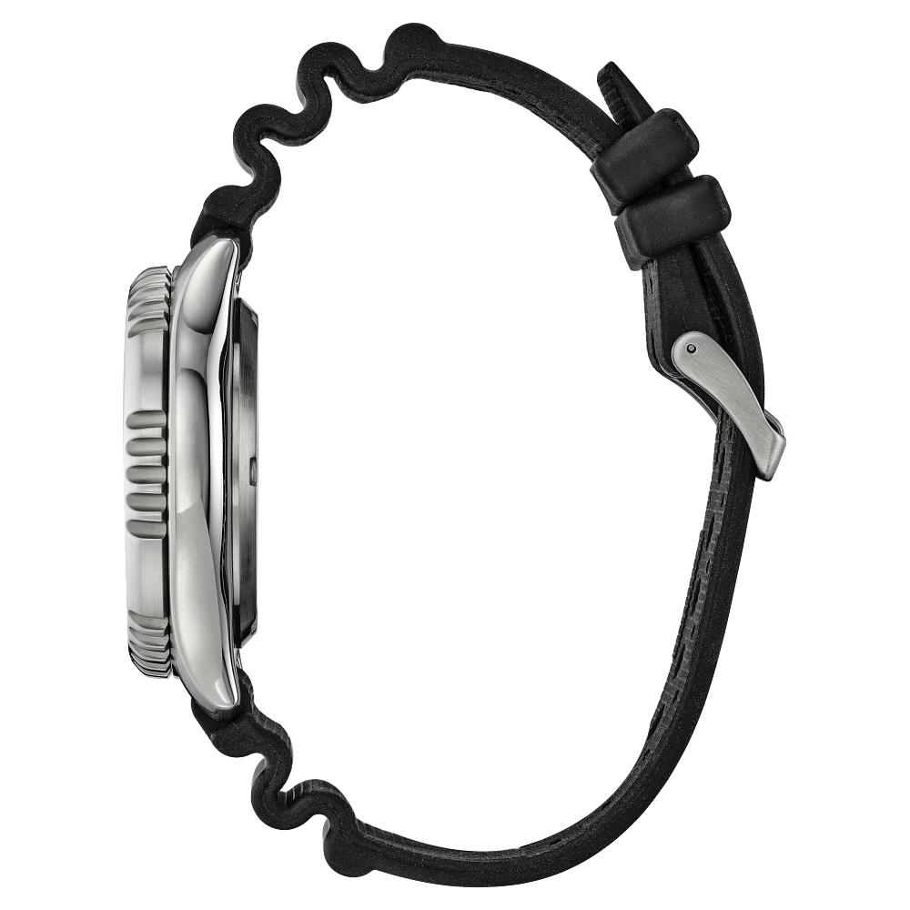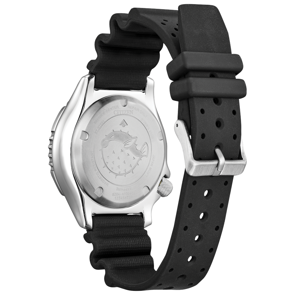 Experience the heritage and innovation of the Citizen Promaster Dive Automatic FUGU Calibre 8204 - NY0130-08E, a modern reinterpretation of the iconic 1989 dive watch. This professional-grade timepiece features a bold 44mm 3-piece case, anti-reflective sapphire crystal, and a durable black polyurethane strap for maximum comfort and durability. Its signature serrated “Fugu” bezel, black aluminum ring, and luminous black dial with markers ensure superior readability in all conditions. The engraved pufferfish case back adds a distinctive touch, while ISO-compliance, a screw-down crown, and 200m water resistance guarantee diving reliability. Powered by the Calibre 8204 automatic movement, this watch arrives in an exclusive collector’s dive tank box—perfect for divers and enthusiasts alike.