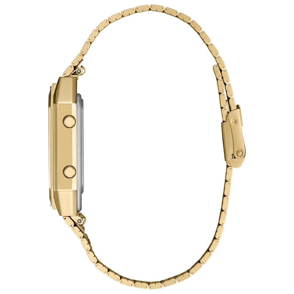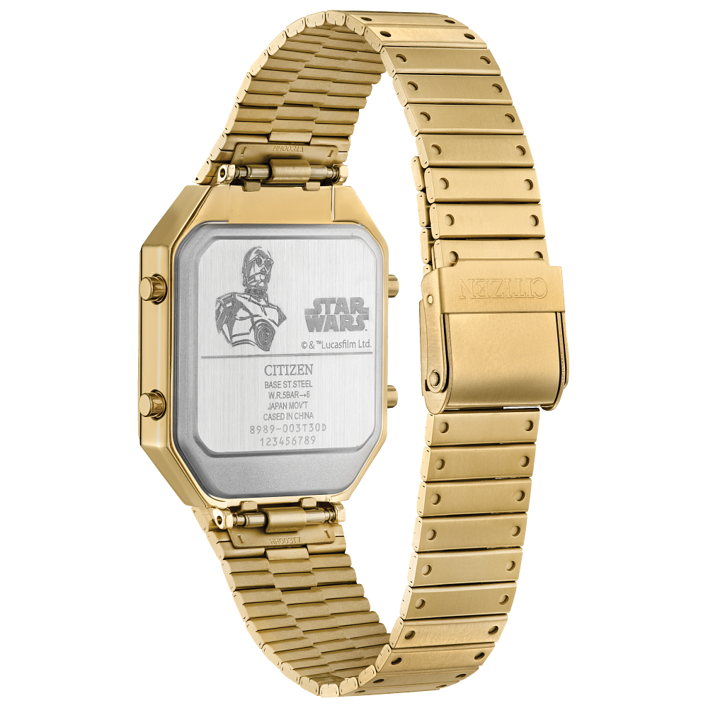 Inspired by the legendary C-3PO™, this dazzling timepiece captures the character’s refined personality and detailed design in a fully updated format. Based on Citizen’s original 1980s analog-digital models, this gold-tone rectangular stainless steel watch features updated screw accents on the bezel, a sleek tapered bracelet, and compact dimensions (33.4mm x 45.4mm) for a bold, retro-futuristic aesthetic.