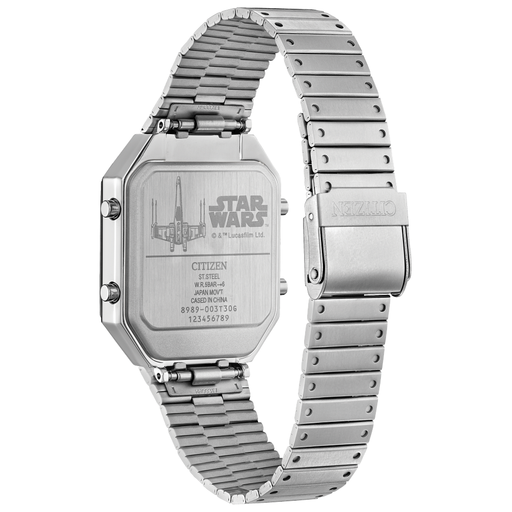Celebrating the legacy of the original trilogy, this bold and nostalgic watch is a modern evolution of Citizen’s 1980s analog-digital design. The grey ion-plated (IP) rectangular stainless steel case and sleek tapered bracelet deliver a rugged, battle-ready look with standout Star Wars™ style.