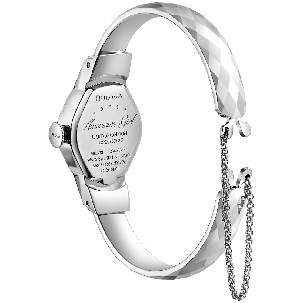 Inspired by the iconic 1957 original, the limited-edition Bulova American Girl - 96L333 reintroduces timeless elegance with a refined modern touch. Featuring a petite tonneau-shaped silver-tone stainless steel case, a double-domed sapphire crystal, and a clean white dial with blue hour and minute hands, this design reflects vintage glamour with contemporary sophistication.