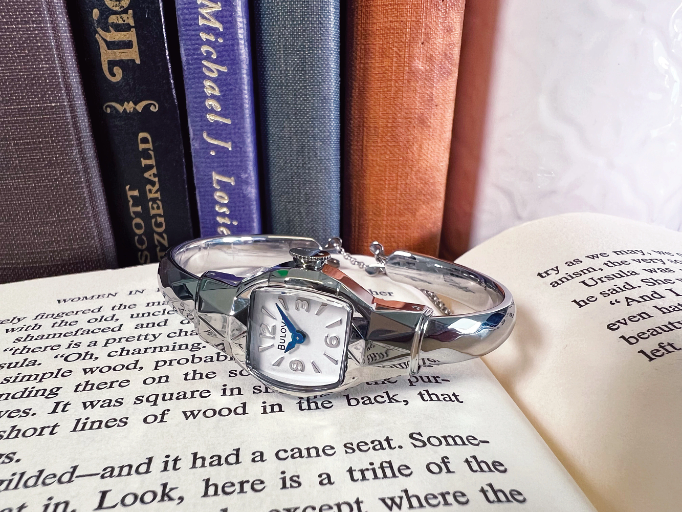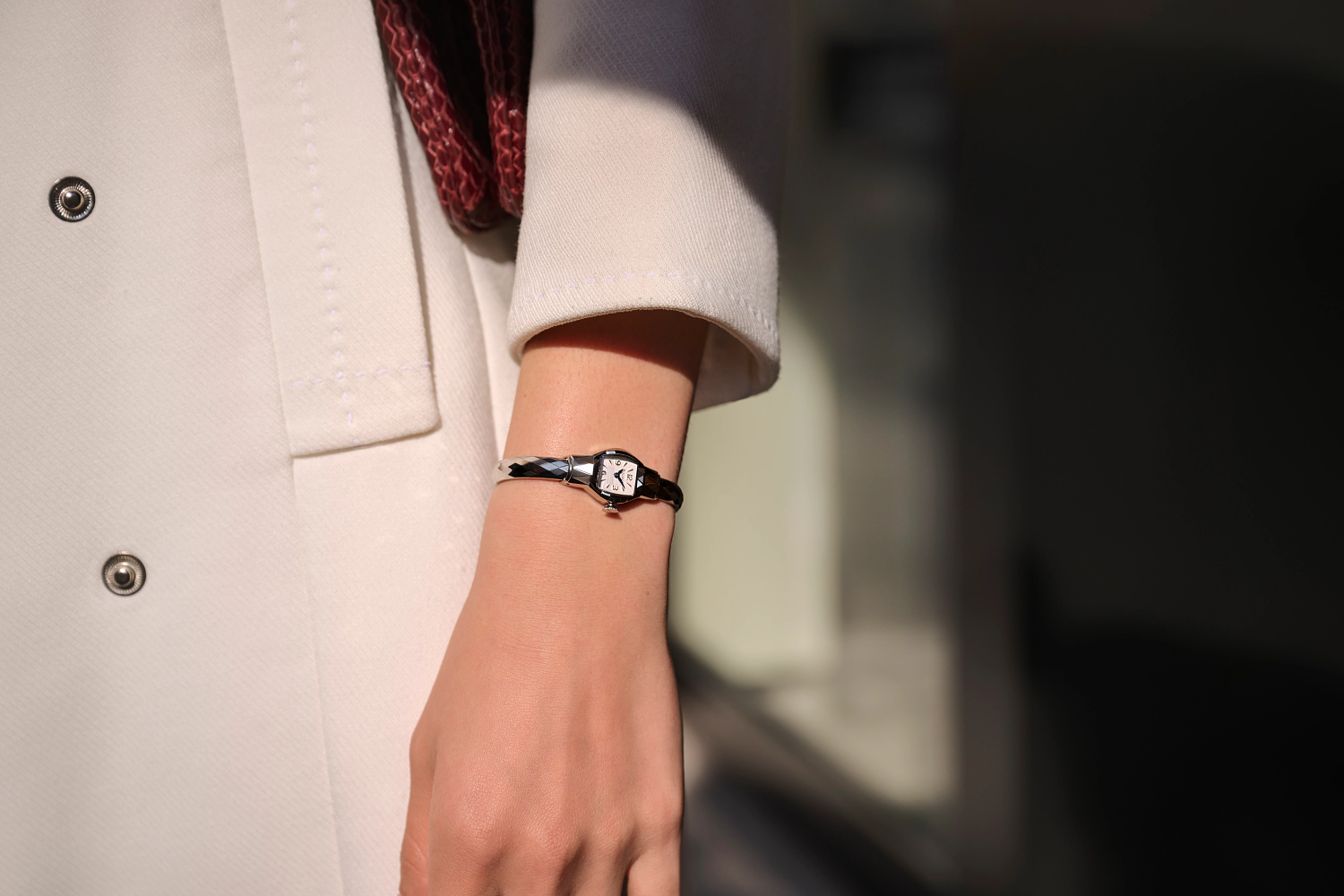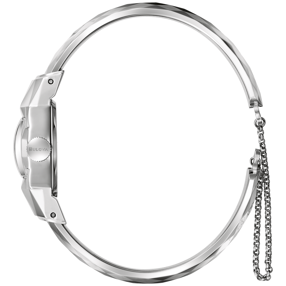 The faceted silver-tone bangle bracelet, finished with jewelry-style chain links and a tongue-in-groove clasp, creates the look of a bracelet and watch in one seamless piece. Limited to just 3,000 numbered pieces worldwide, this exquisite timepiece is presented in a luxurious red keepsake box with white satin lining—an essential accessory for lovers of classic femininity and heritage design.