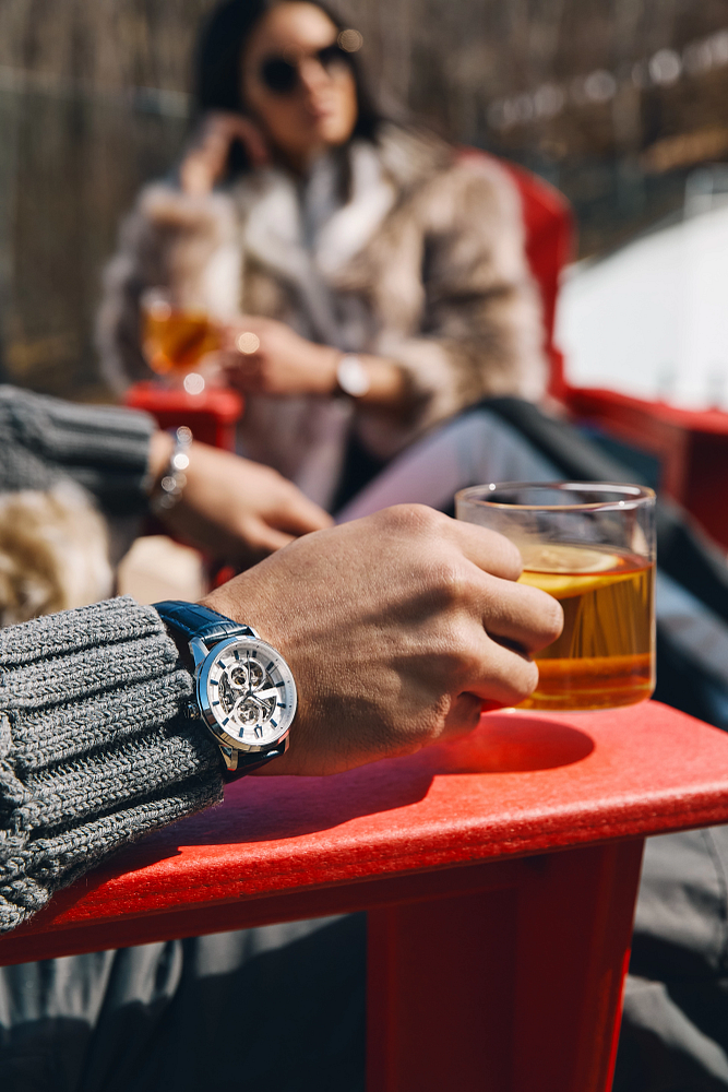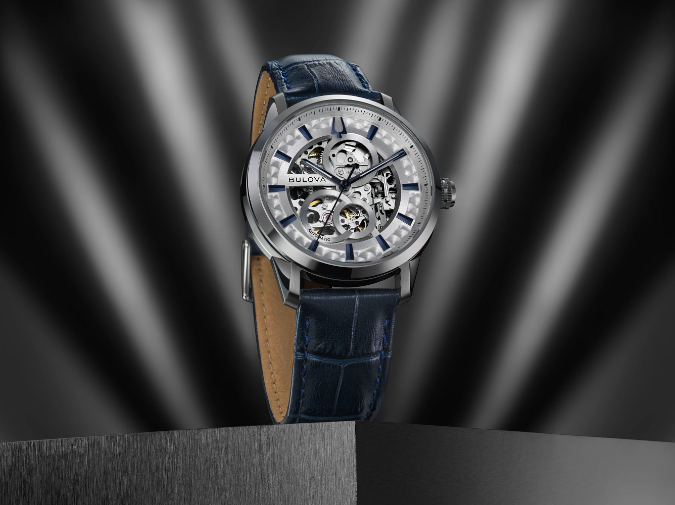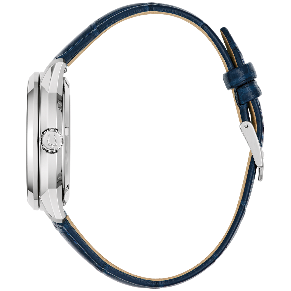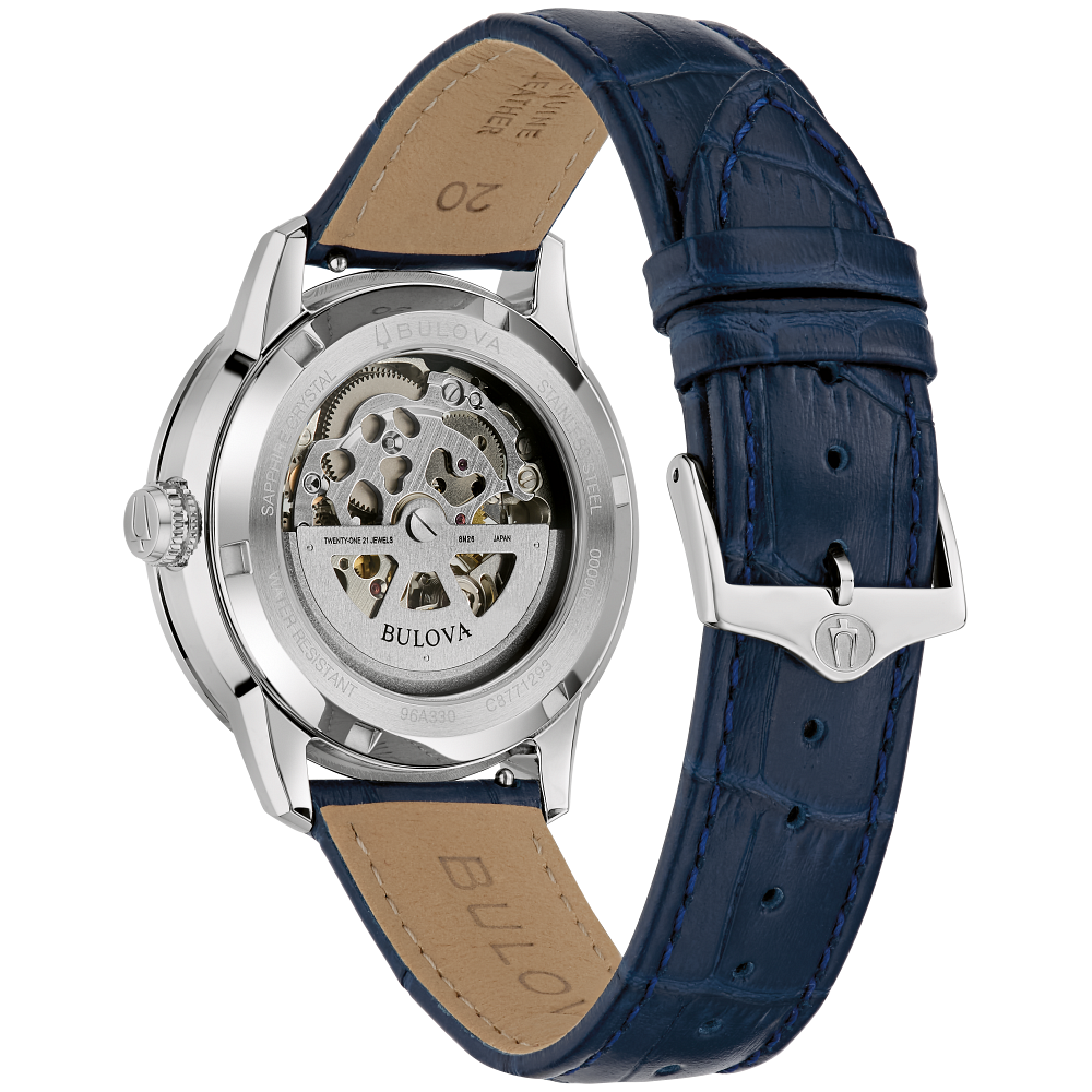Elegant and contemporary, the Bulova Sutton - 96A330 men’s automatic watch showcases its intricate mechanics through a refined openworked dial with blue accents. Featuring a sculpted silver-tone stainless steel case, sapphire crystal, and a 21-jewel skeletonized automatic movement with a 42-hour power reserve, it’s finished with a blue alligator-embossed leather strap for a sophisticated, elevated look.