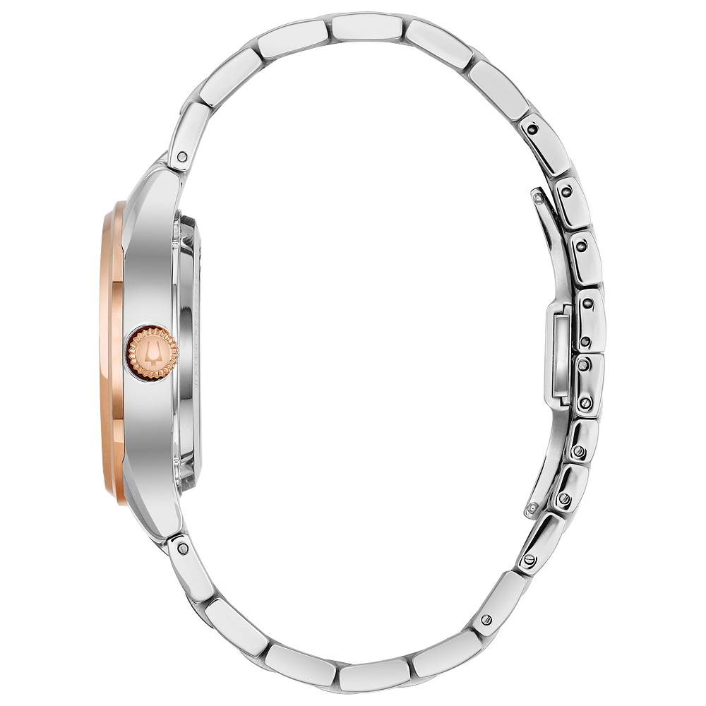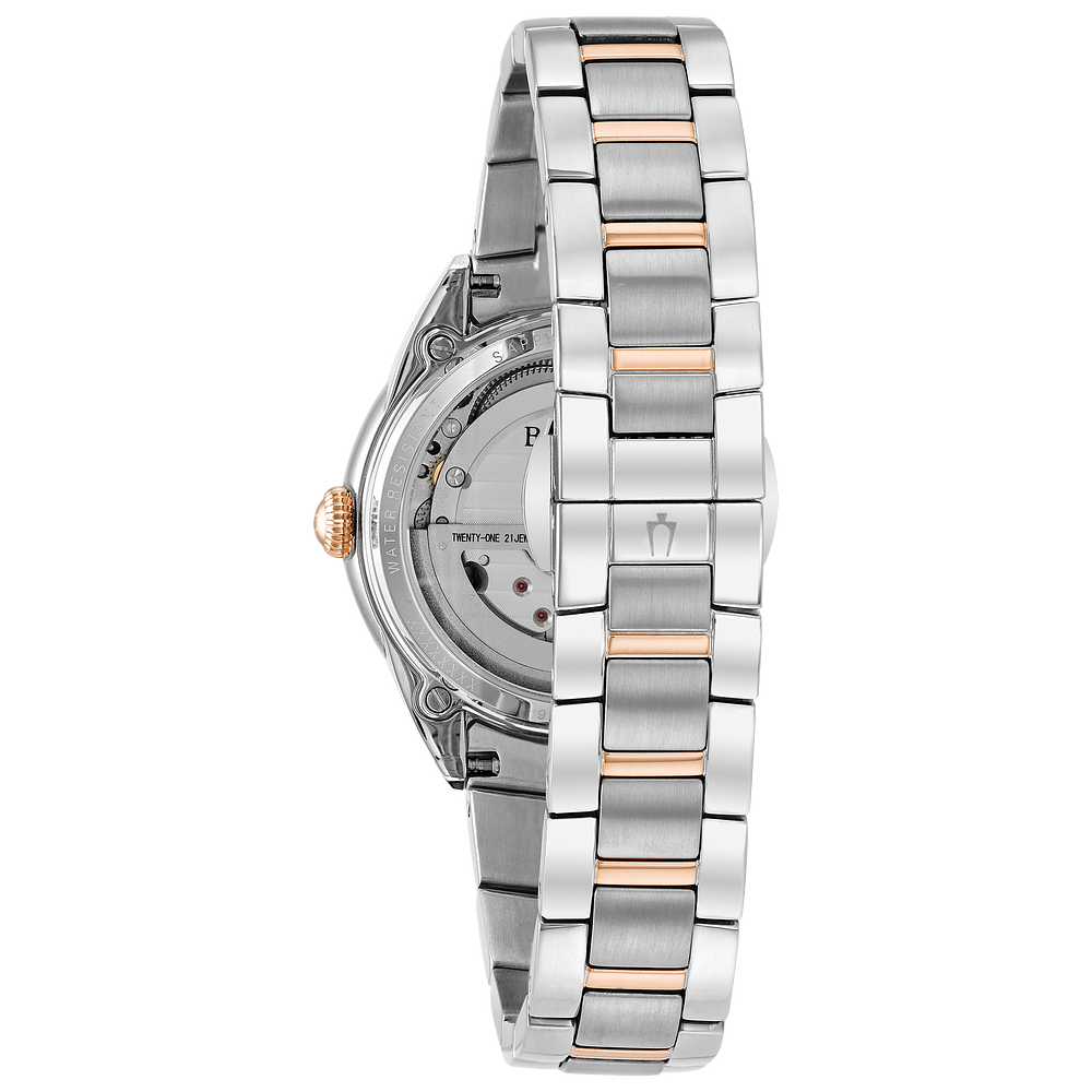 Refined elegance meets mechanical artistry in the Bulova Sutton - 98P170, a stunning ladies’ automatic timepiece from the distinguished Ladies’ Diamonds Collection. Designed for those who appreciate timeless beauty and traditional craftsmanship, this watch blends luxurious materials with captivating movement details.