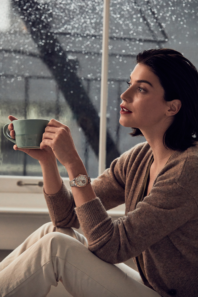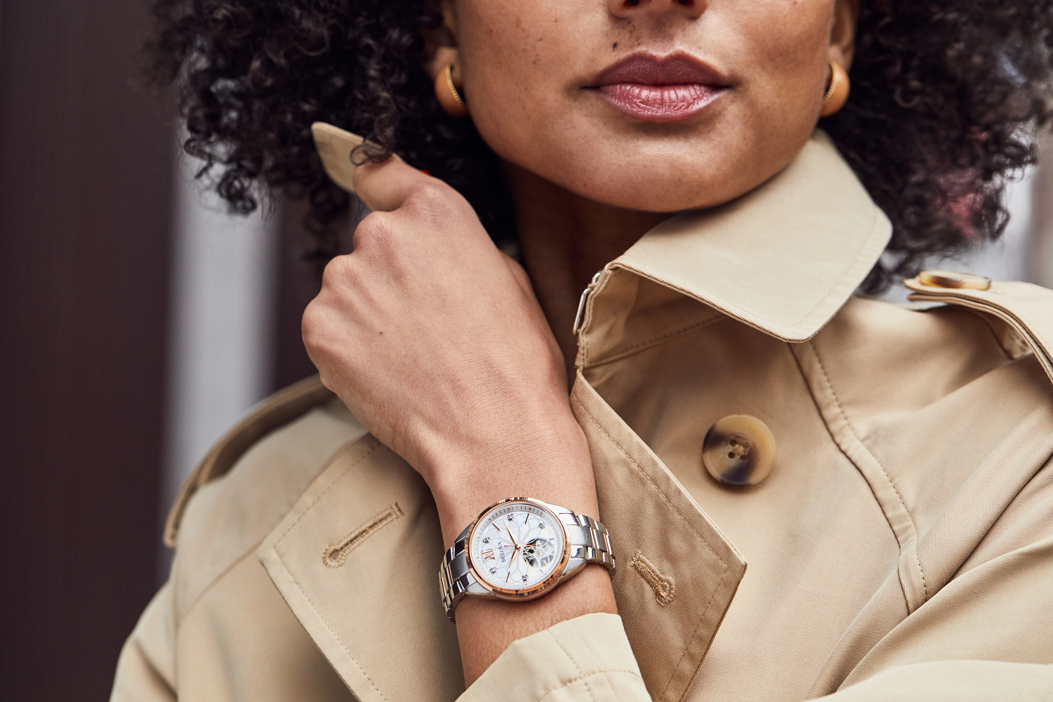 The stainless steel case is enhanced with warm rose gold-tone accents, creating a graceful two-tone aesthetic that complements any style. A domed sapphire crystal protects the exquisite white mother-of-pearl dial, where five individually hand-set diamonds shimmer with understated brilliance. An open aperture reveals the automatic heart-beat movement beneath, offering a mesmerizing glimpse into the watch’s inner mechanics.