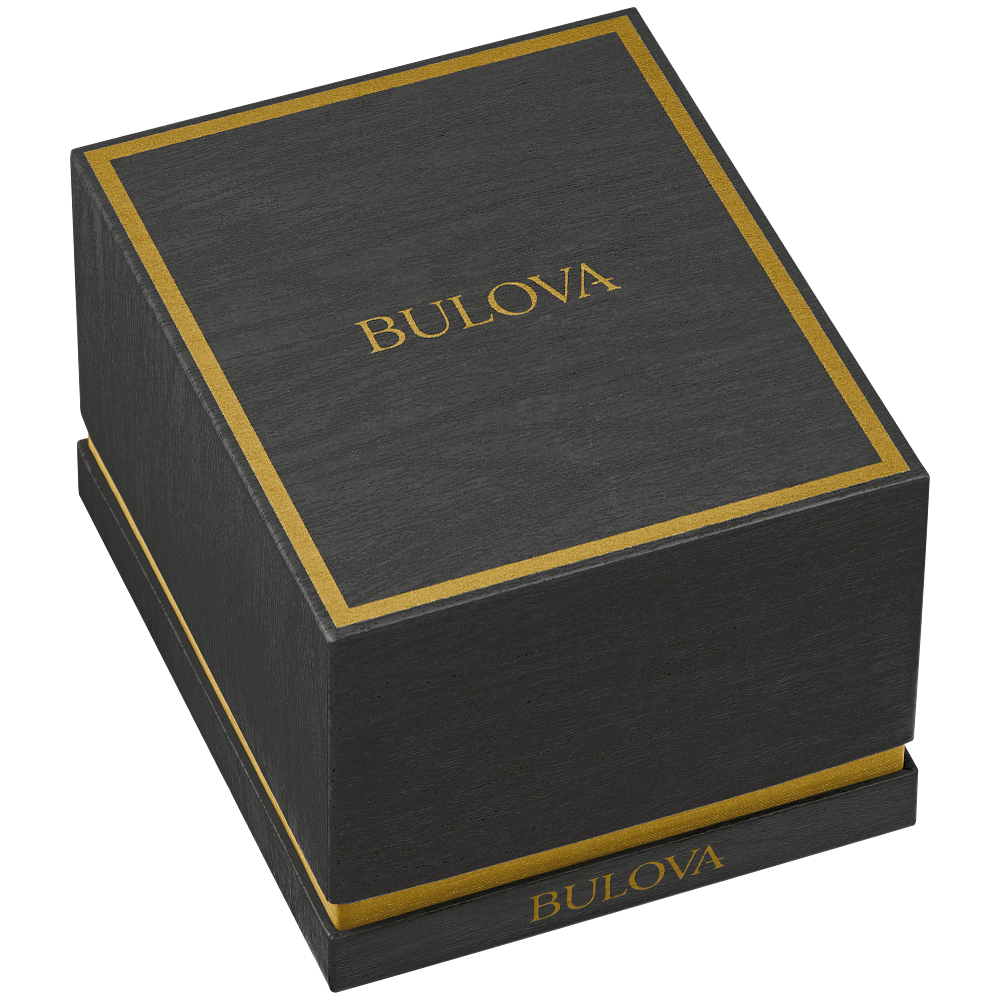 Turning the watch over, the exhibition caseback further showcases the finely engineered automatic movement, powered by Calibre 82S0 with an impressive 40-hour power reserve. This self-winding movement reflects the heritage and precision craftsmanship synonymous with Bulova.