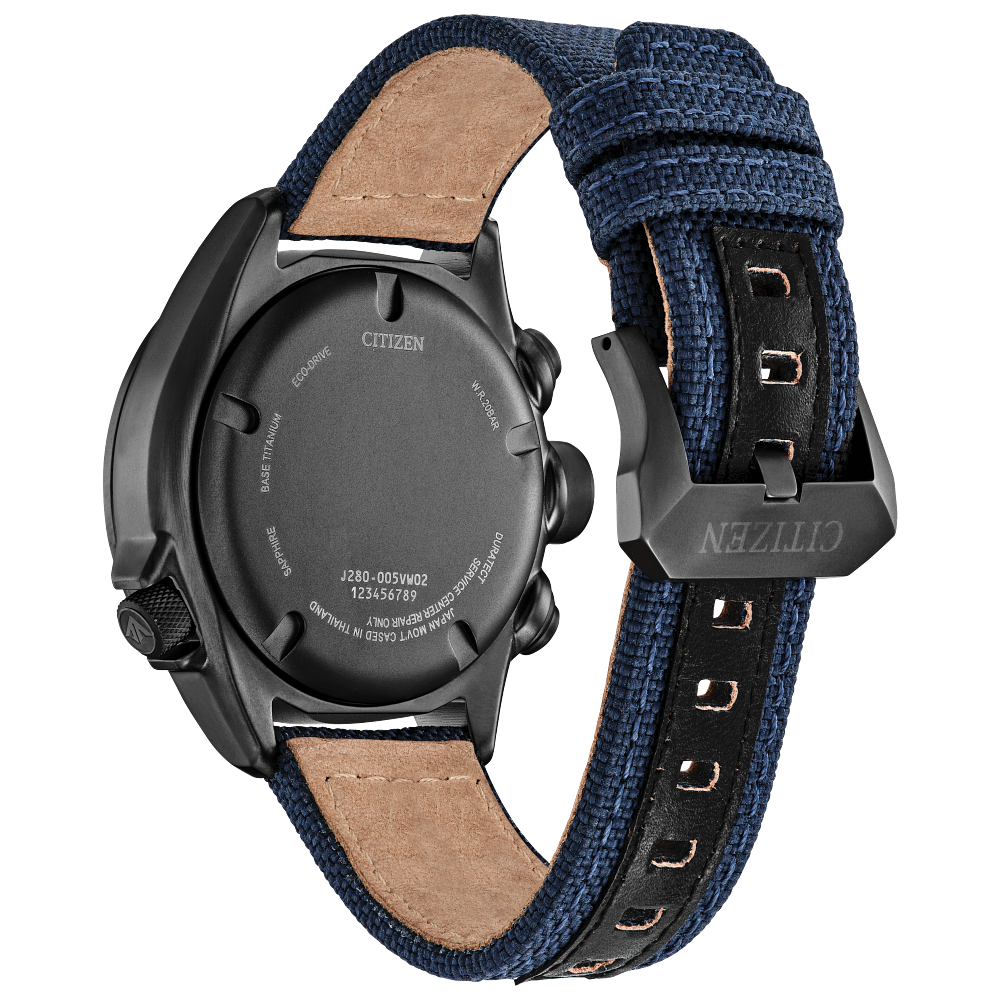 Built for the toughest terrains, this 47mm Super Titanium™ timepiece with black DLC coating is rugged, lightweight, and sleek. A navy dial with luminous accents and yellow highlights ensures clear readability. Equipped with an altimeter, electronic compass, and date display, it’s powered by Eco-Drive technology—no battery required. Water resistant to 200m. Calibre J280.