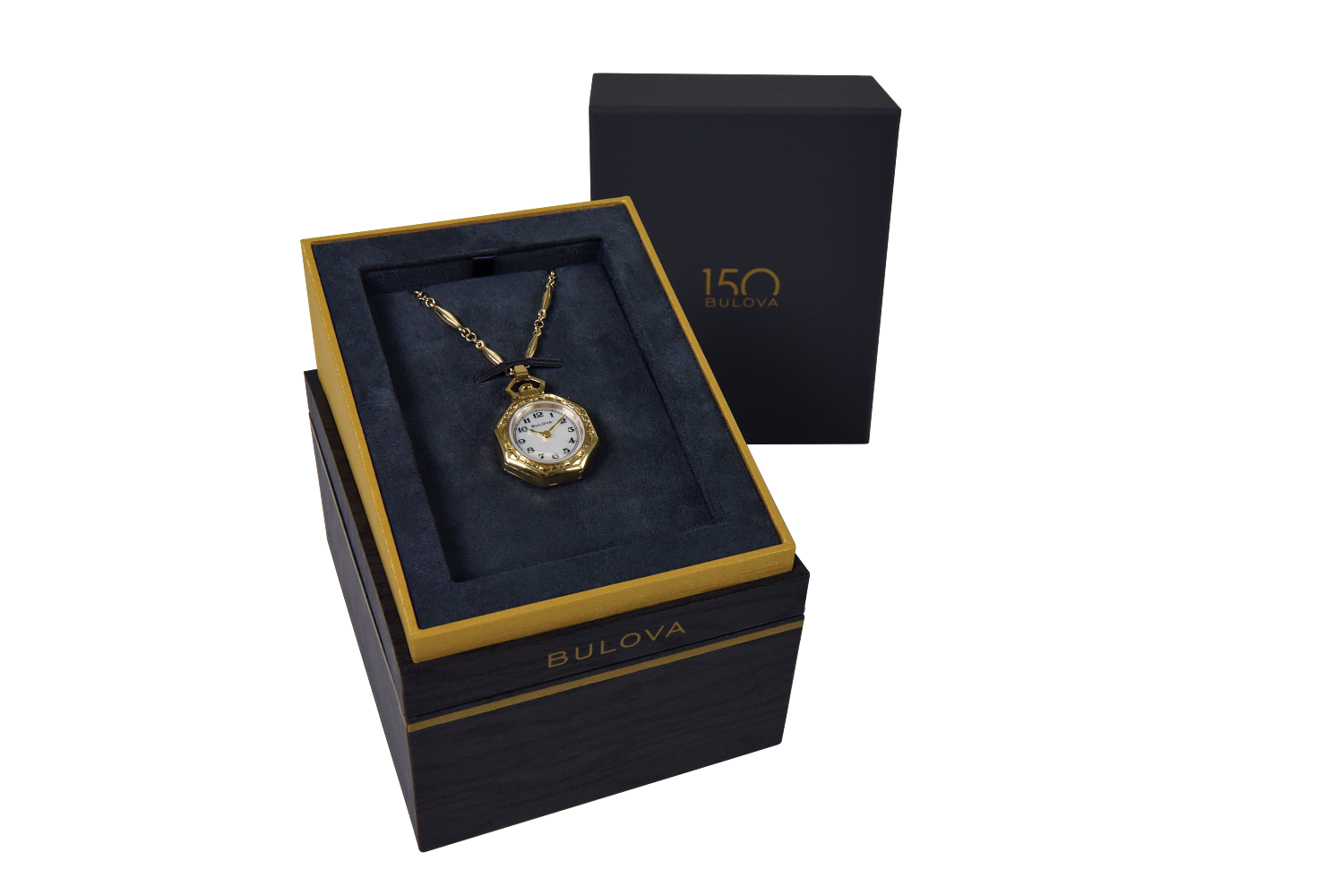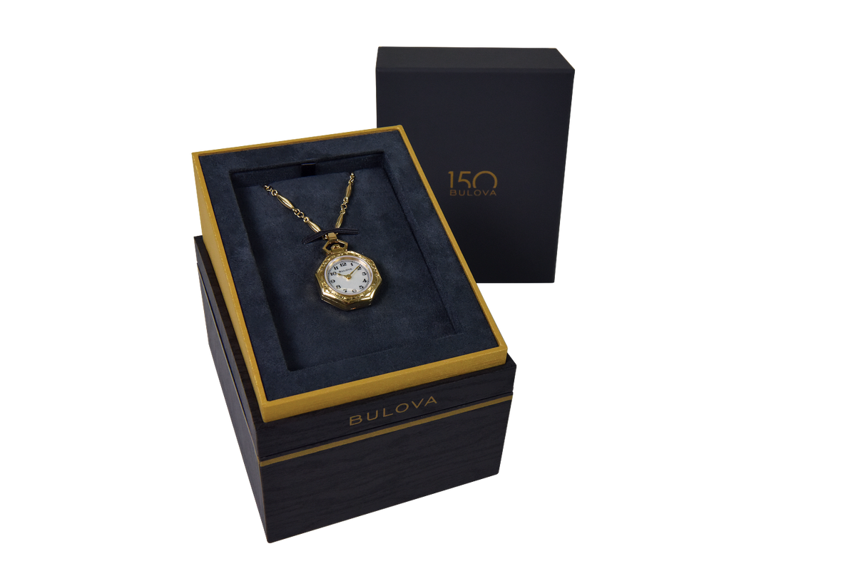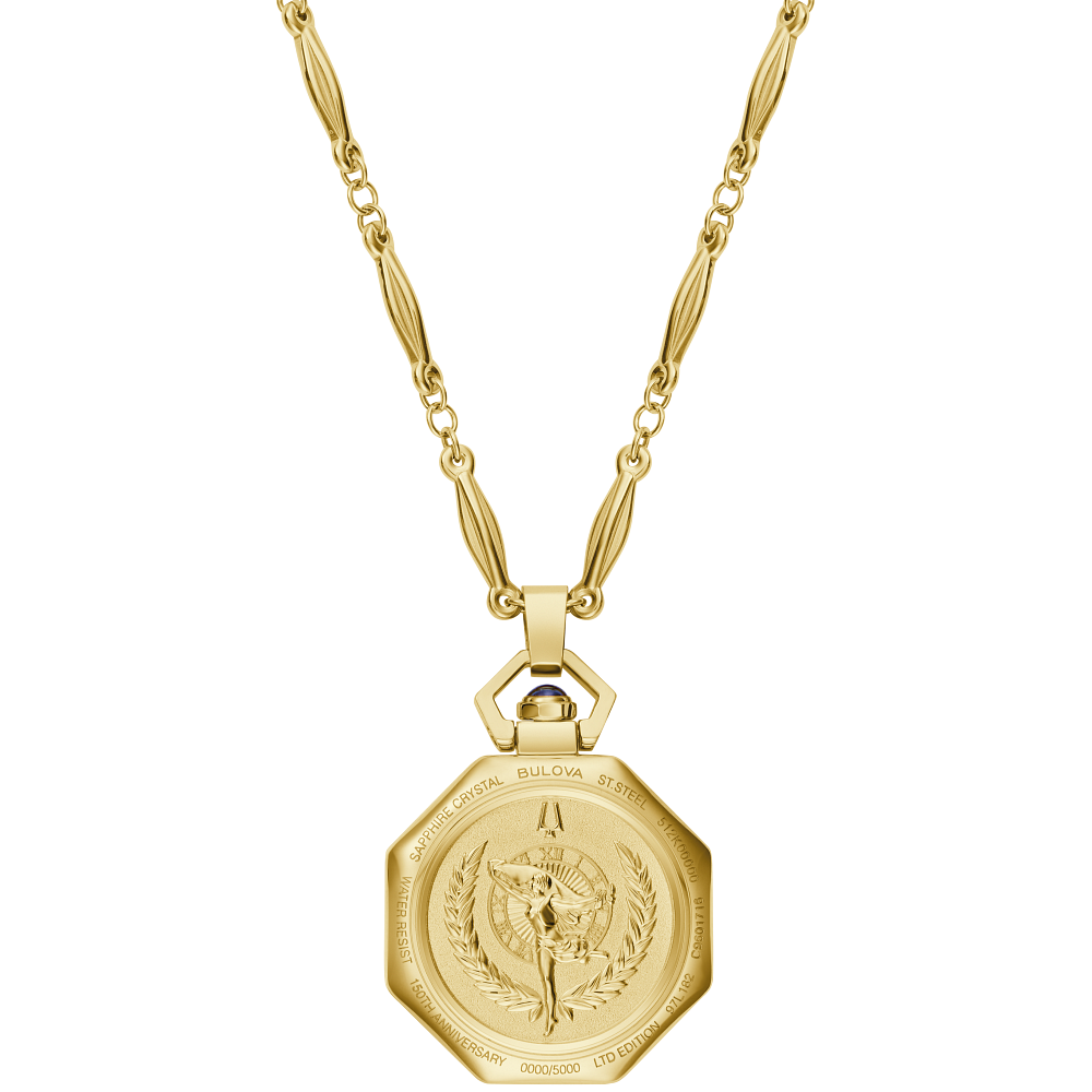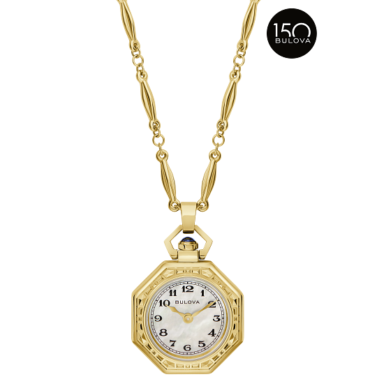 Inspired by Bulova’s early 20th-century Rubaiyat creations, the Bulova Rubaiyat Pendant Necklace – 97L182 celebrates the brand’s 150th Anniversary with a refined blend of vintage elegance and modern versatility. Drawing from a 1919 original, this limited-edition design features a polished octagonal gold-tone stainless steel case highlighted by a raised decorative border and a blue synthetic spinel cabochon set into the 12 o’clock crown.